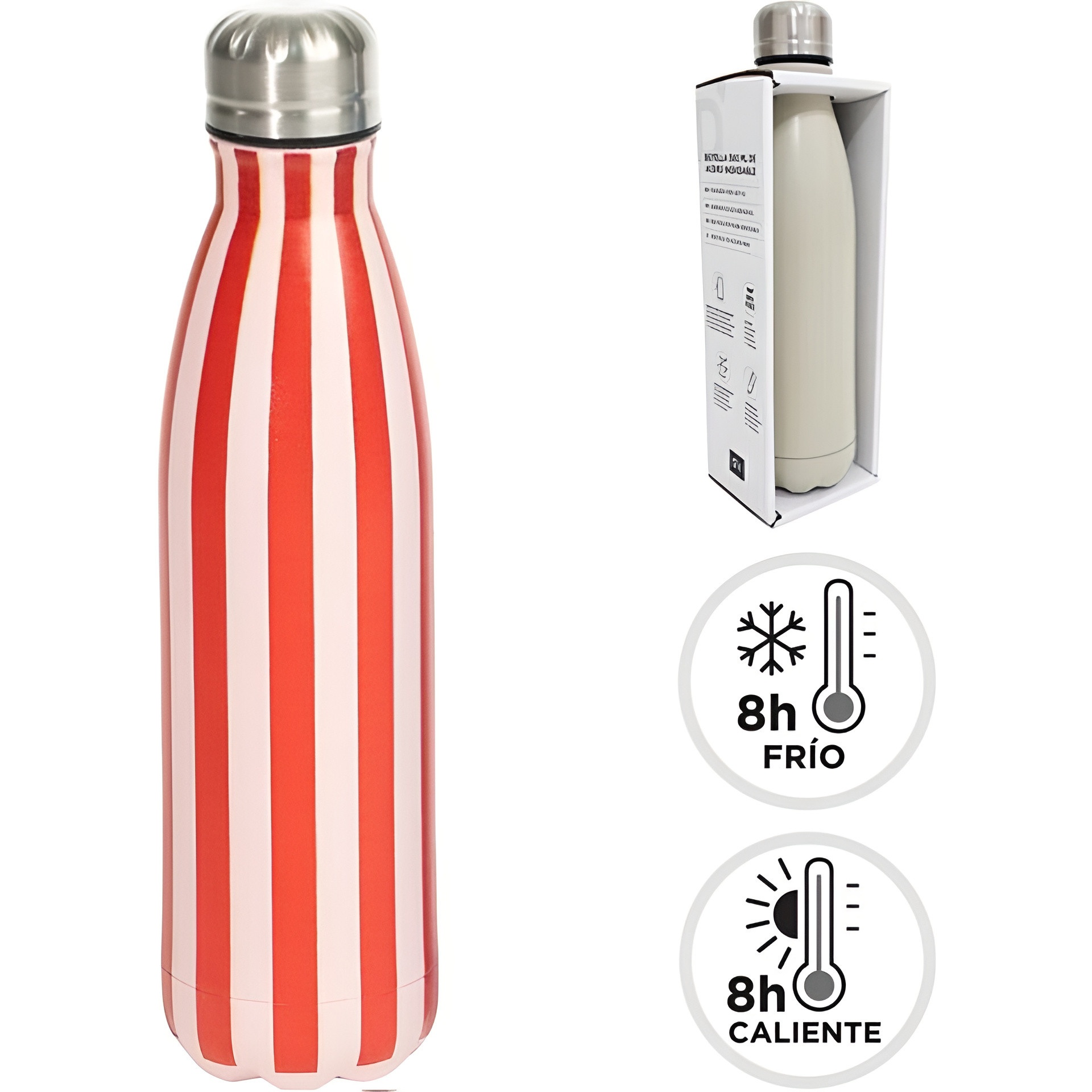 Thermoflasche im gestreiften Design, die Stil und Funktionalität vereint. Ihr kompaktes Format und der auslaufsichere Verschluss machen sie ideal, wenn Sie Ihr Lieblingsgetränk den Tag über mitnehmen möchten. Wiederverwendetes Design für alle, die eine praktische und charakterstarke Alternative suchen. Perfekt als Begleiter im Alltag, beim Sport oder auf Reisen.