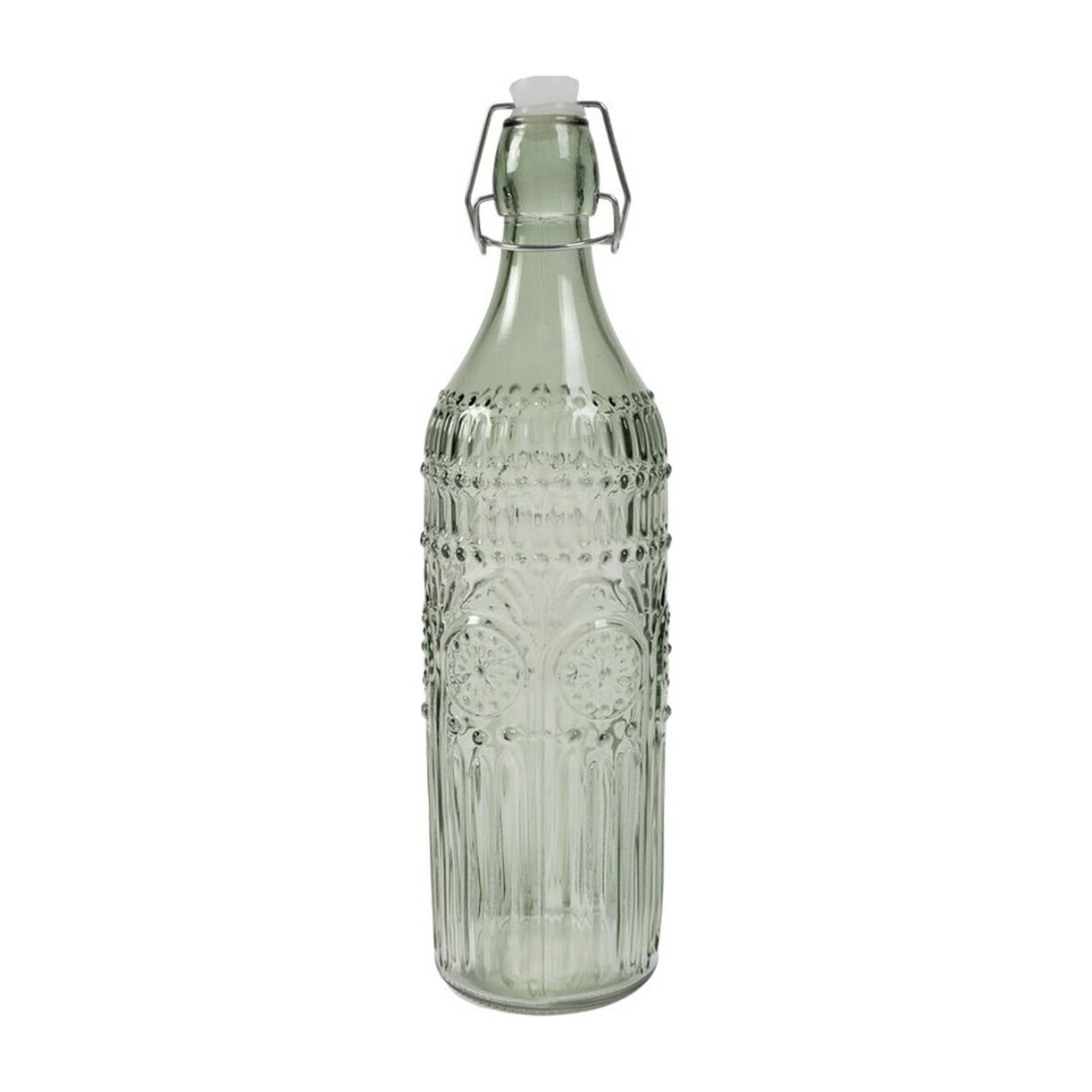 Elegante, wiederverwendbare Glasflasche mit filigraner aquagrüner Prägung, die Ihrem Tisch einen dezenten Vintage-Charme verleiht. Der dichte Bügelverschluss garantiert sicheren Transport und verhindert Verschütten. Mit 1 L Fassungsvermögen vielseitig einsetzbar für Wasser, Säfte und kalte Getränke - zugleich funktional und dekorativ. Eine stilvolle, nachhaltige Lösung, um Einwegverpackungen zu reduzieren.