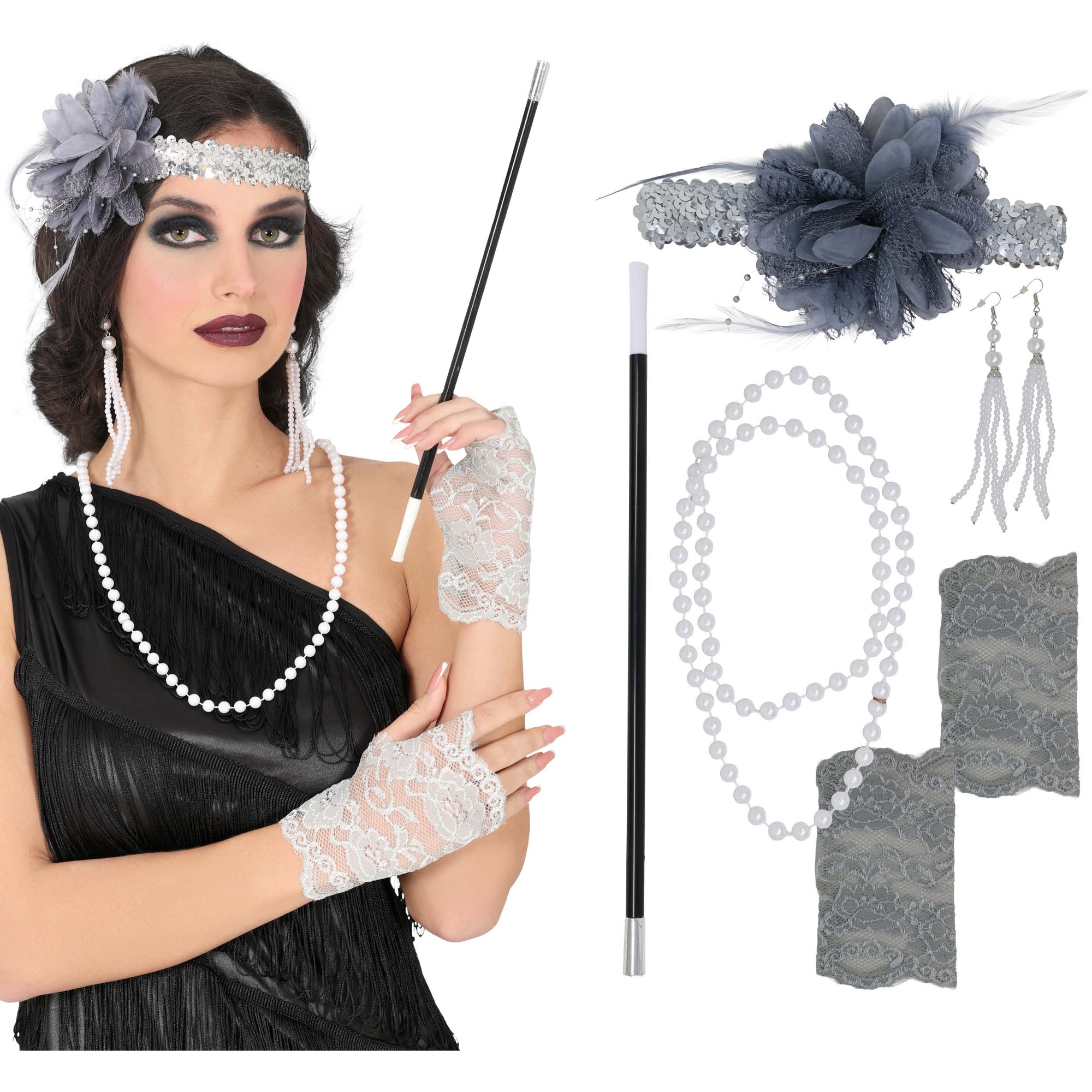 Erzielen Sie einen authentischen Charleston-Look mit diesem eleganten Accessoire-Set im Stil der 1920er Jahre. Das Set bringt Vintage-Glamour durch eine Kombination aus Glanz, Spitze und Federn und sorgt für ein raffiniertes Erscheinungsbild. Leichte, komfortable Teile werten jedes Outfit im Retro-Stil auf und sorgen für Bewegung und Stil. Ideal zum Abrunden Ihres Retro-Outfits bei Themenpartys, Fotoshootings oder besonderen Anlässen. Synthetische Materialien erhalten Glanz und Form.