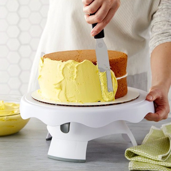 Mit diesem Drehsockel wird das Dekorieren jedes Teils Ihrer Torte viel einfacher. Die höchste Einstellung ist genau die richtige Höhe, um Ränder und Seitenteile zu formen, während die niedrigste Einstellung perfekt für die Dekoration der Oberseite ist.