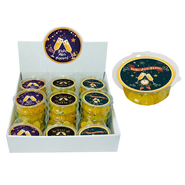 Mini-Behälter mit Fruchtgummis, die Sie für die Silvestertrauben austauschen können.