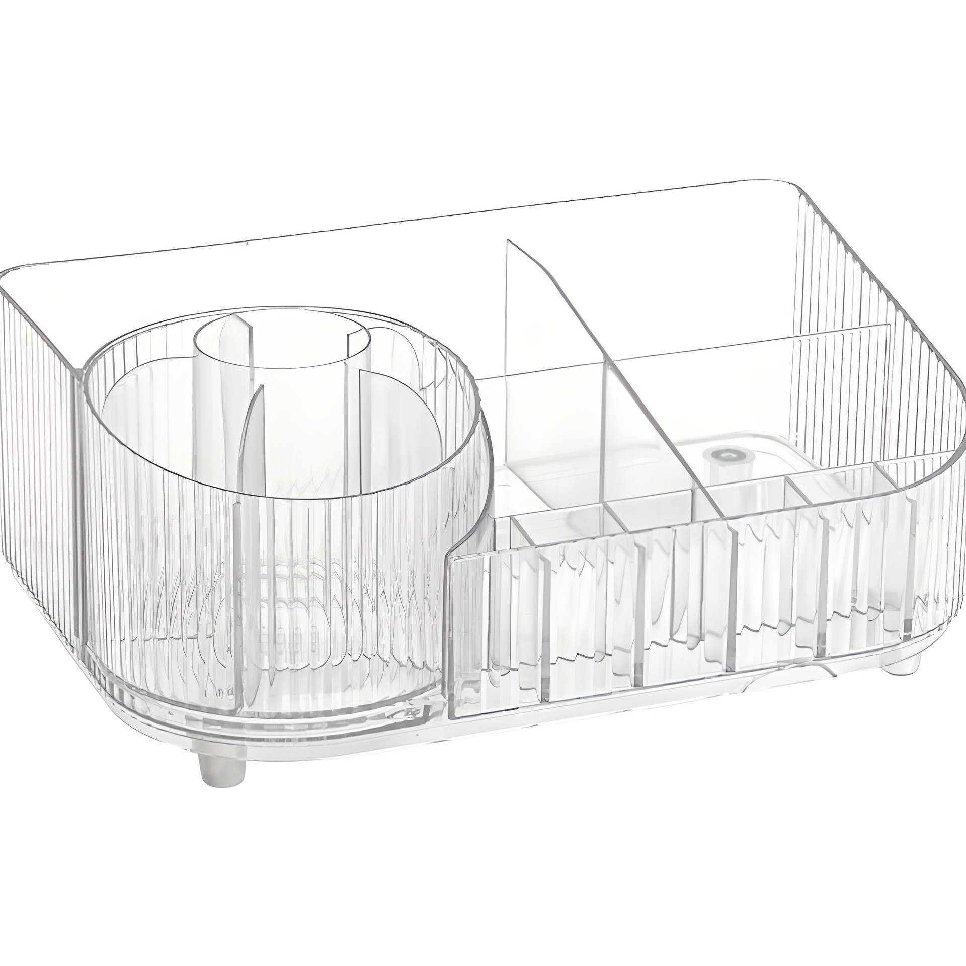 Die unterschiedlichen Fächer ermöglichen die Sortierung nach Produktart und -größe, während der zentrale Pinselhalter die Pinsel vertikal hält und so schnellen Zugriff gewährleistet. Das kompakte, transluzente Design nutzt den Platz auf dem Schminktisch optimal, ohne auf Stil zu verzichten.