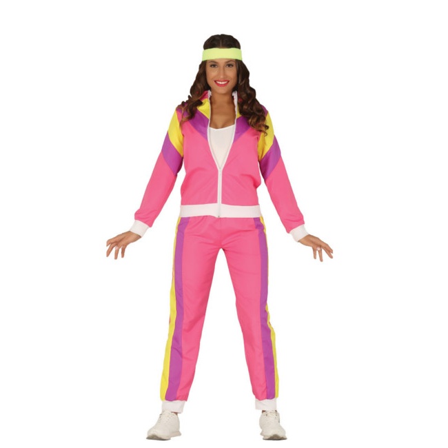 Die Kleidungsstücke sehen aus wie ein Trainingsanzug mit Jacke und Hose, die Jacke hat einen Reißverschluss für mehr Komfort und die Hose mit Bündchen hat einen Gummizug in der Taille. Es ist rosa und kombiniert Streifen in Lila, Gelb und Weiß.