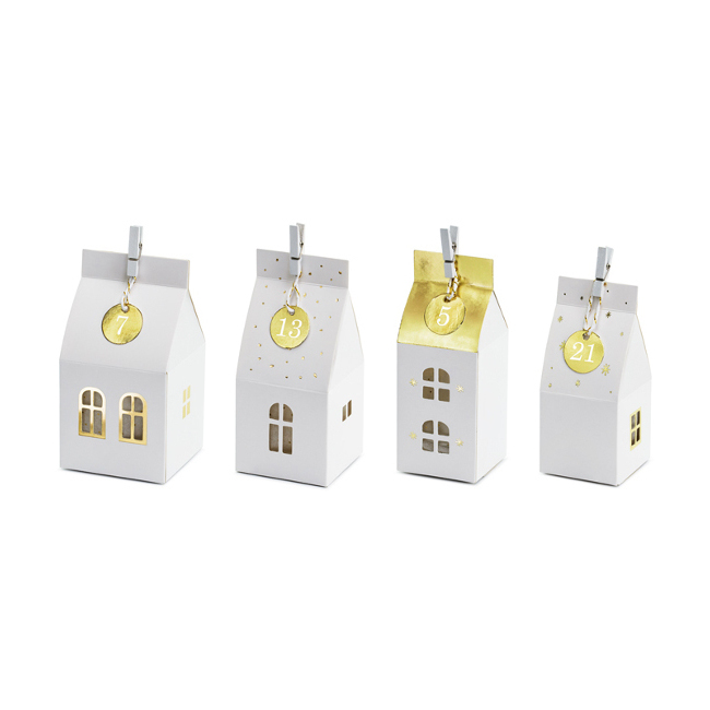 Ein zauberhaftes Set mit kleinen Papierhäuschen, die mit Zahlenaufklebern verziert sind. Ideal für die Vorbereitung auf die Ankunft von Weihnachten, zur Verschönerung Ihrer Dekoration oder als besonderer Leckerbissen für Gäste bei Ihren Feierlichkeiten.