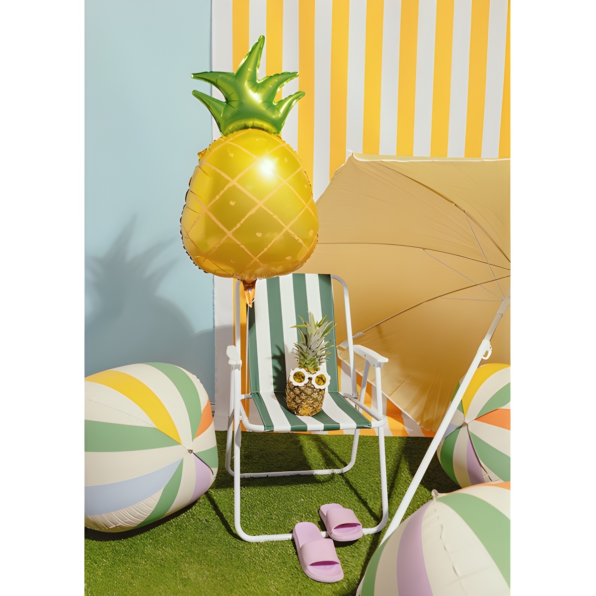 Folienballon mit Ananas?Motiv in Gelb und Grün, ideal, um Ihrer Feier einen tropischen und auffälligen Akzent zu verleihen. Sie können ihn mit Helium oder Luft befüllen; das selbstsiegelnde Ventil ermöglicht eine schnelle und sichere Handhabung. Der Ballon verfügt über Ösen zum Aufhängen und eine glänzende Oberfläche, die ihn zum Blickfang auf Tischen, Fotowänden (Photocalls) und thematischen Dekorationen macht.