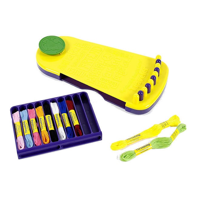 Dies ist ein Webstuhl zur Herstellung von Freundschaftsarmbändern. Die runde Schließe hält das Armband während des Webvorgangs fest.