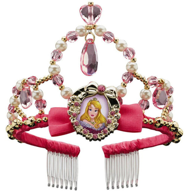 Prinzessin Auroras Diadem mit schönen rosa und goldenen Perlen und Perlen, bedeckt mit rosa Band und einer Kamee mit Auroras Bild in der Mitte mit einer kleinen Schleife in der Mitte.