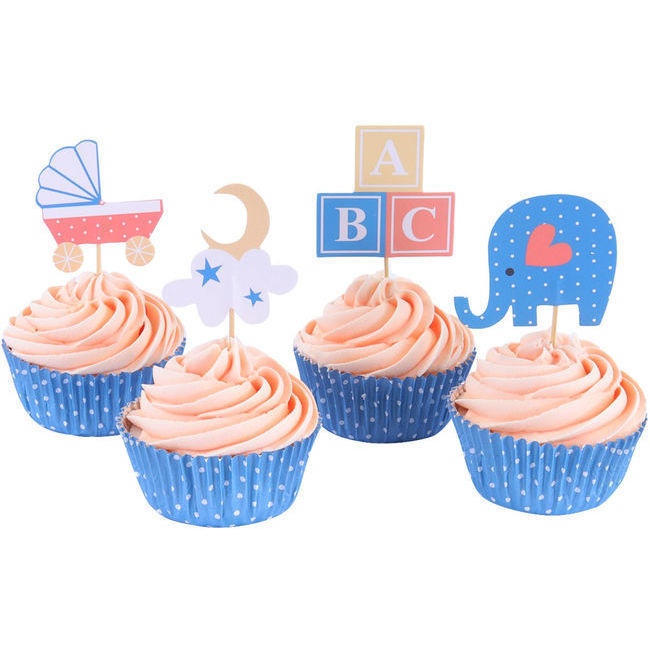 Süße Packung mit Cupcake-Kapseln und schönen Picks, ideal zum Backen und Dekorieren Ihrer Desserts bei Ihrer Babyparty oder Geburtsfeier.
