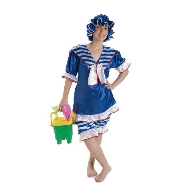 Marineblaues Hemd mit einer Schleife, die mit der blau-weiß gestreiften Hose kombiniert wird. Dazu gibt es die typische Badekappe, die damals in Mode war, mit einem roten Band und einem Gummiband, damit sie sich besser an die Kopfgröße anpasst.