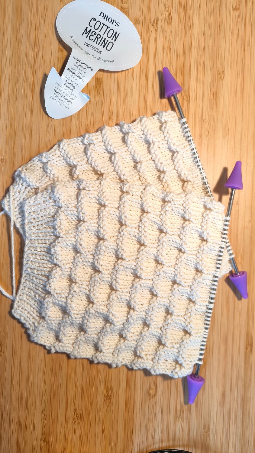 Eine gemischte Wolle aus Merino und Baumwolle mit Elastizität, geeignet für strukturierte Muster, Zopfmuster und Reiskornmuster. Sie lässt sich sehr angenehm verarbeiten, und mit ihr können Sie komfortable Kleidungsstücke mit gut definierten und gleichmäßigen Maschen herstellen. Ideal für Kinder und Babys.