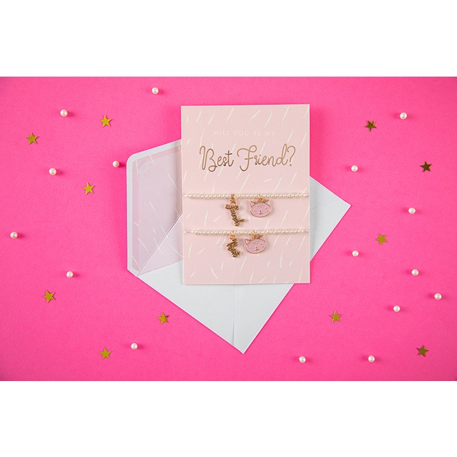 - Beide Armbänder sind aus Perlen gefertigt und haben rosa Kätzchen-Anhänger. Auf jedem steht das Wort "Best" oder "Friend".