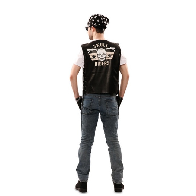 Das realistische Kostüm besteht aus einem Stofftuch mit dekorativem Totenkopfmuster und einer schwarzen Kunstlederweste mit verschiedenen Abzeichen und Emblemen, die mit einem Haken- und Ösenverschluss versehen ist. Ergänzt wird es durch Handschuhe, die Leder imitieren und mit silbernen Nieten verziert sind.