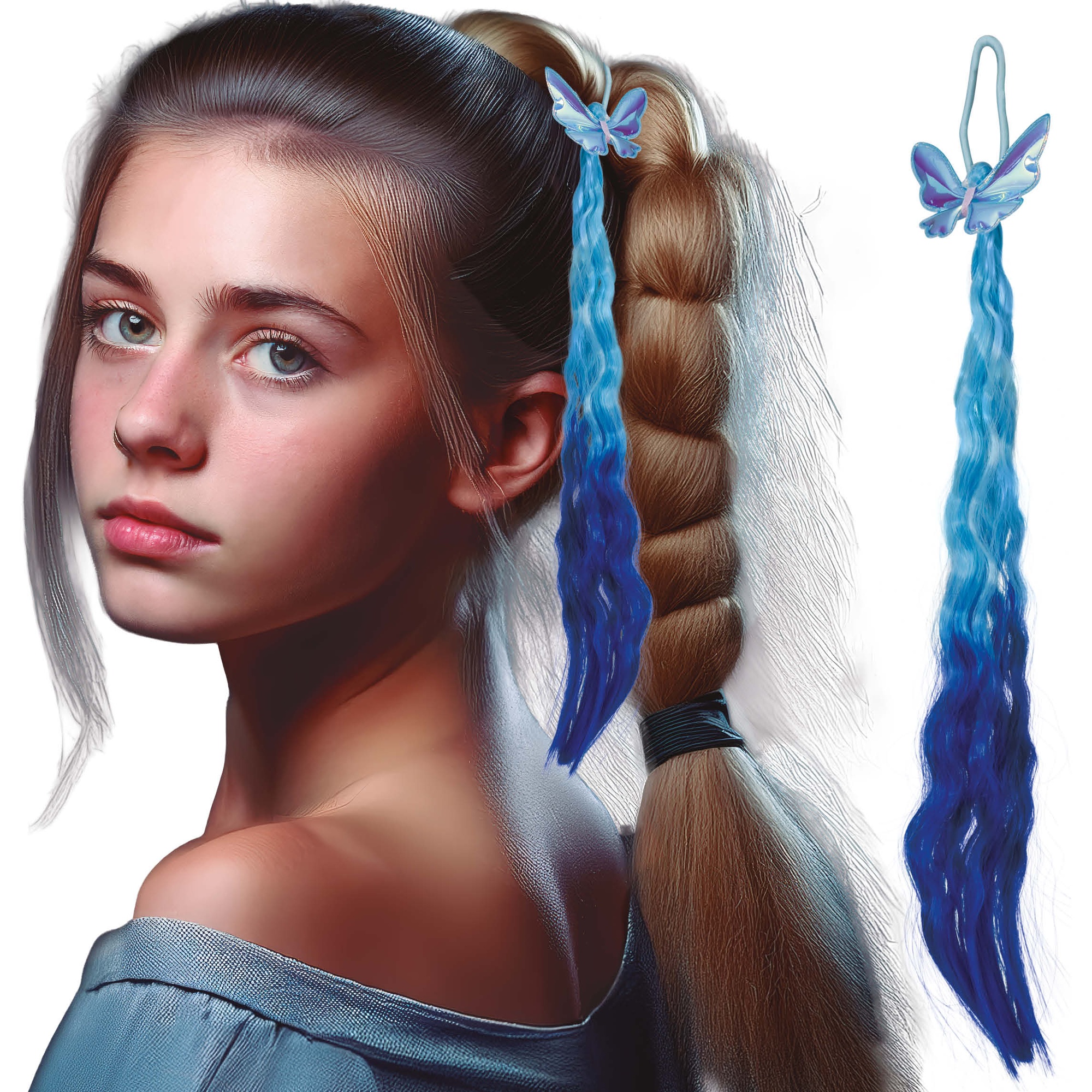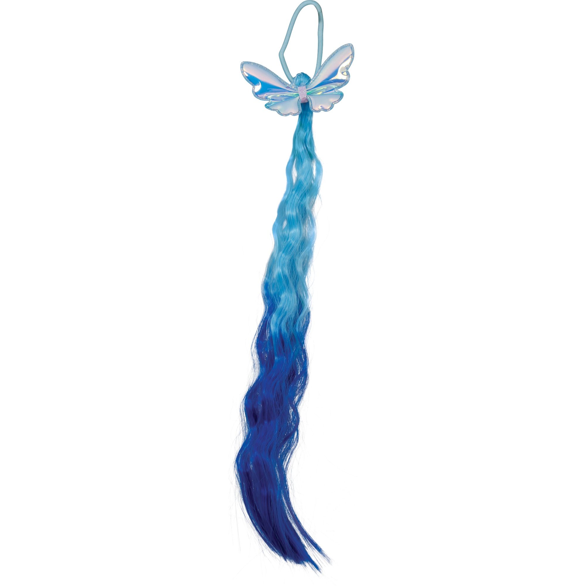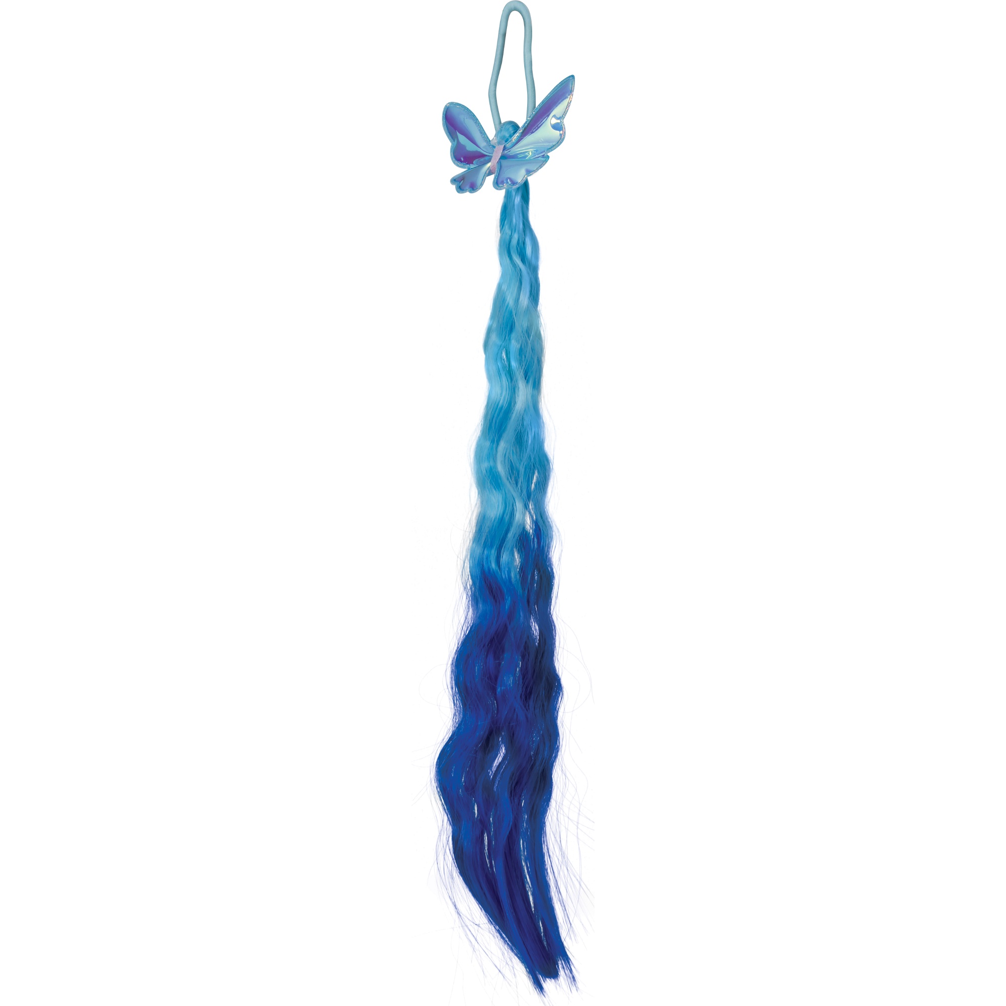 Synthetische Strähne im Blauverlauf mit dekorativem Schmetterlingsclip. Sie ist 35 cm lang und verleiht Ihrer Frisur zusätzlichen Farb- und Bewegungseffekt. Der Clipverschluss ermöglicht eine schnelle und sichere Anbringung. Aus PVC gefertigt für ein glänzendes, robustes Finish - ideal, um Zöpfe und Pferdeschwänze mit einem jugendlichen, verspielten Akzent zu personalisieren.
