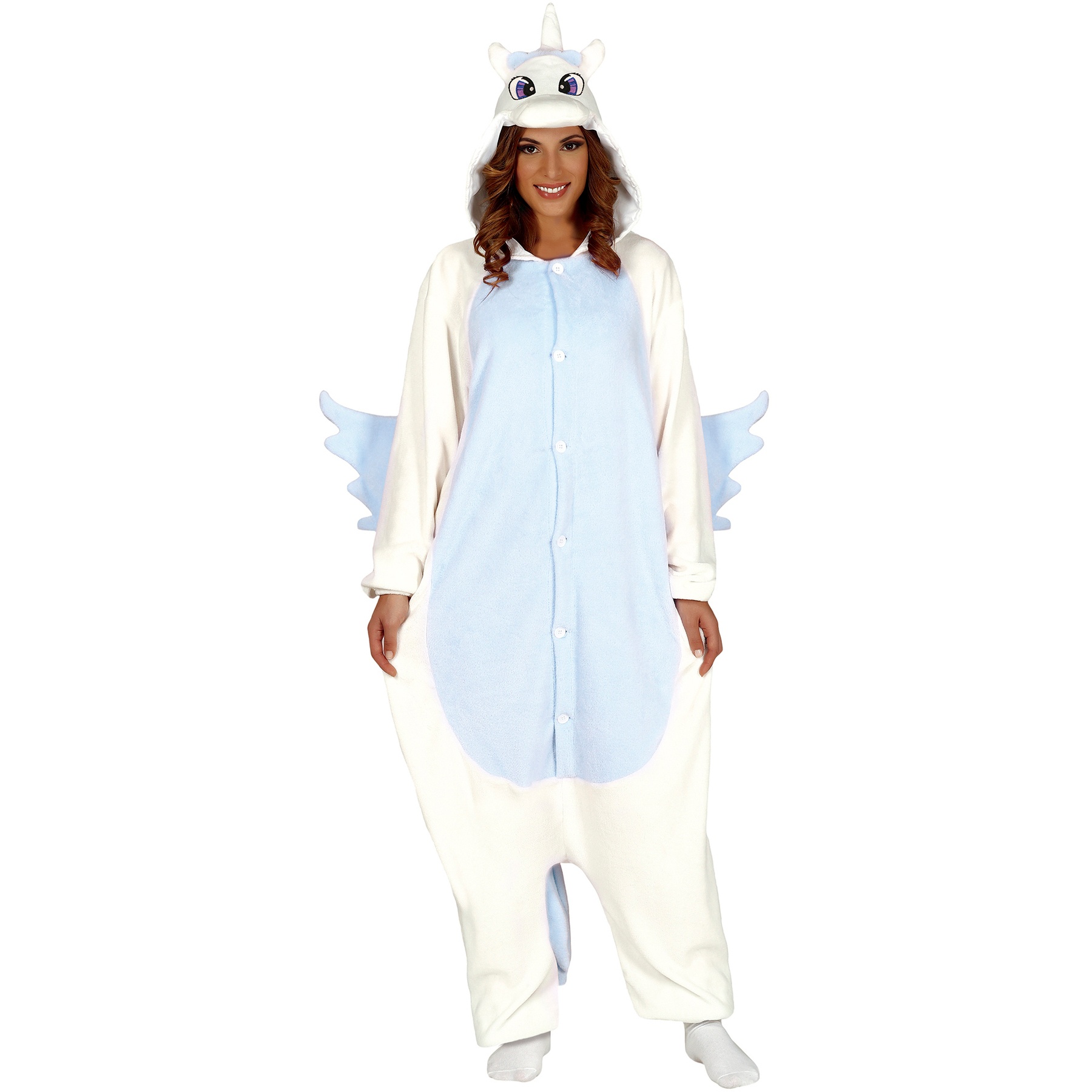 Dieses tolle Einhorn-Kostüm ist sowohl für Männer als auch für Frauen geeignet und besteht aus einem weißen Overall mit blauem Bauch und blauen Details. Die Kapuze, die aus einem Stück besteht, enthält die Merkmale des Tieres, einschließlich des niedlichen Horns. Auf dem Rücken befinden sich Flügel und ein langer blauer Schwanz.