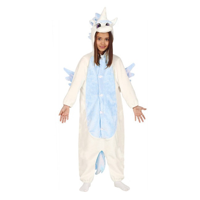 Es besteht aus einem weißen Overall mit langen Ärmeln und einer Kapuze, die den Kopf des Einhorns simuliert.