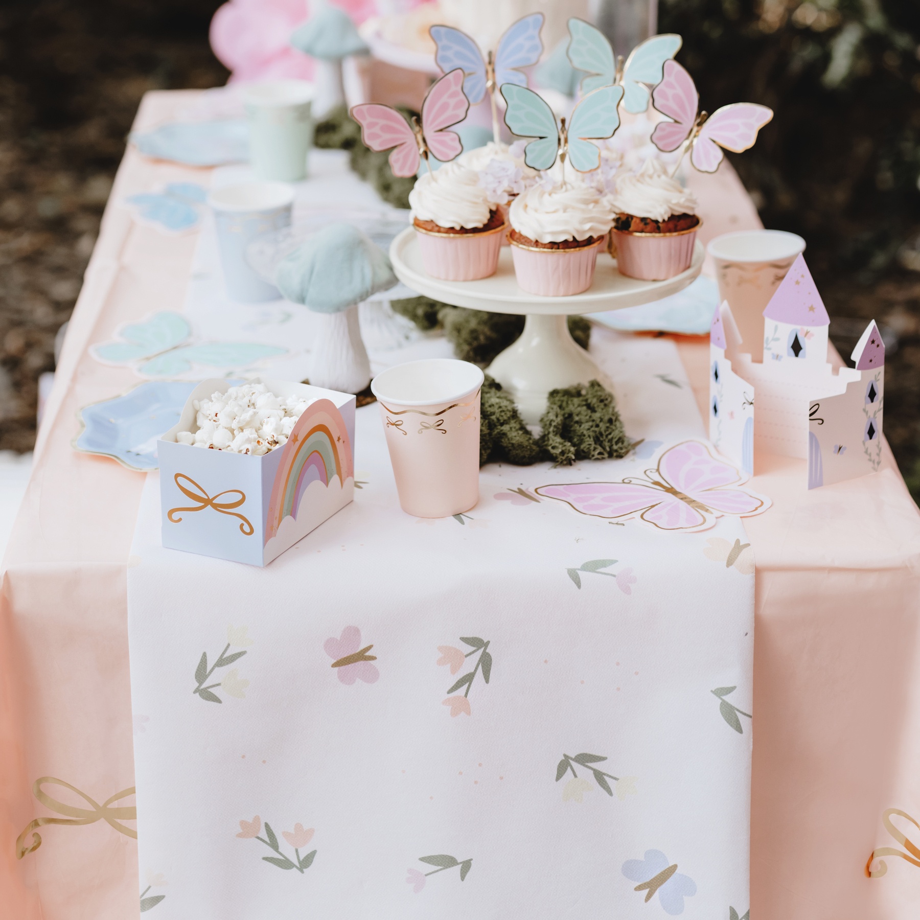 • Tischläufer mit Blumen- und Schmetterlingsmotiv.