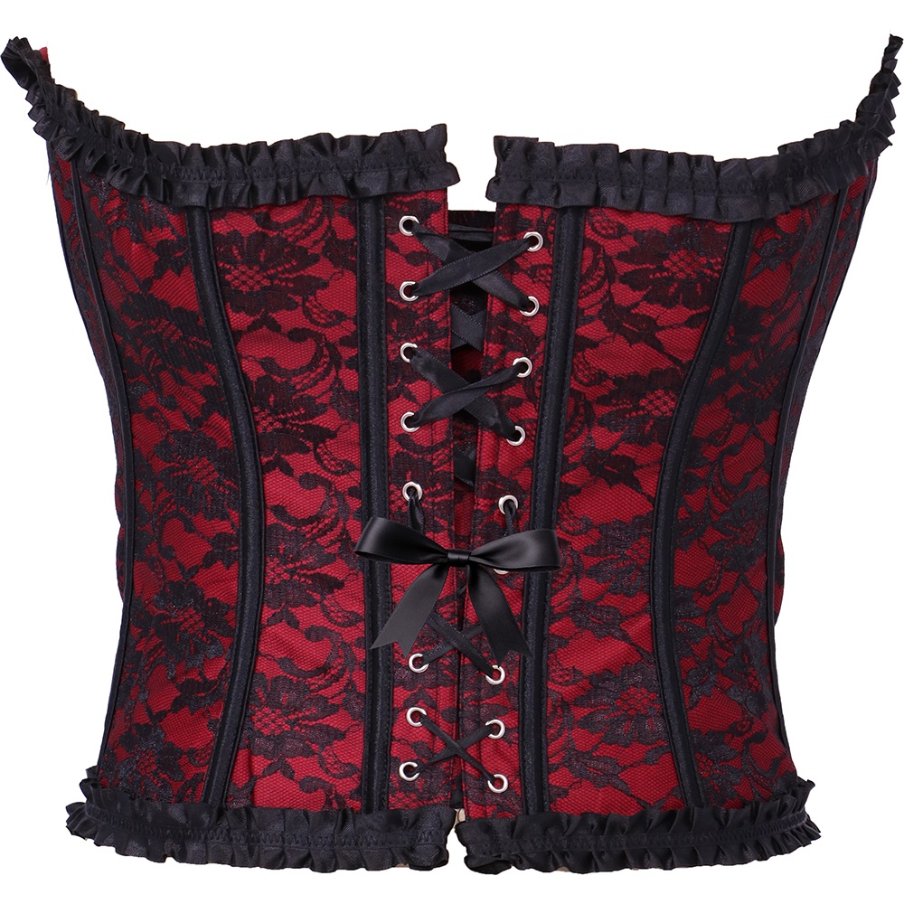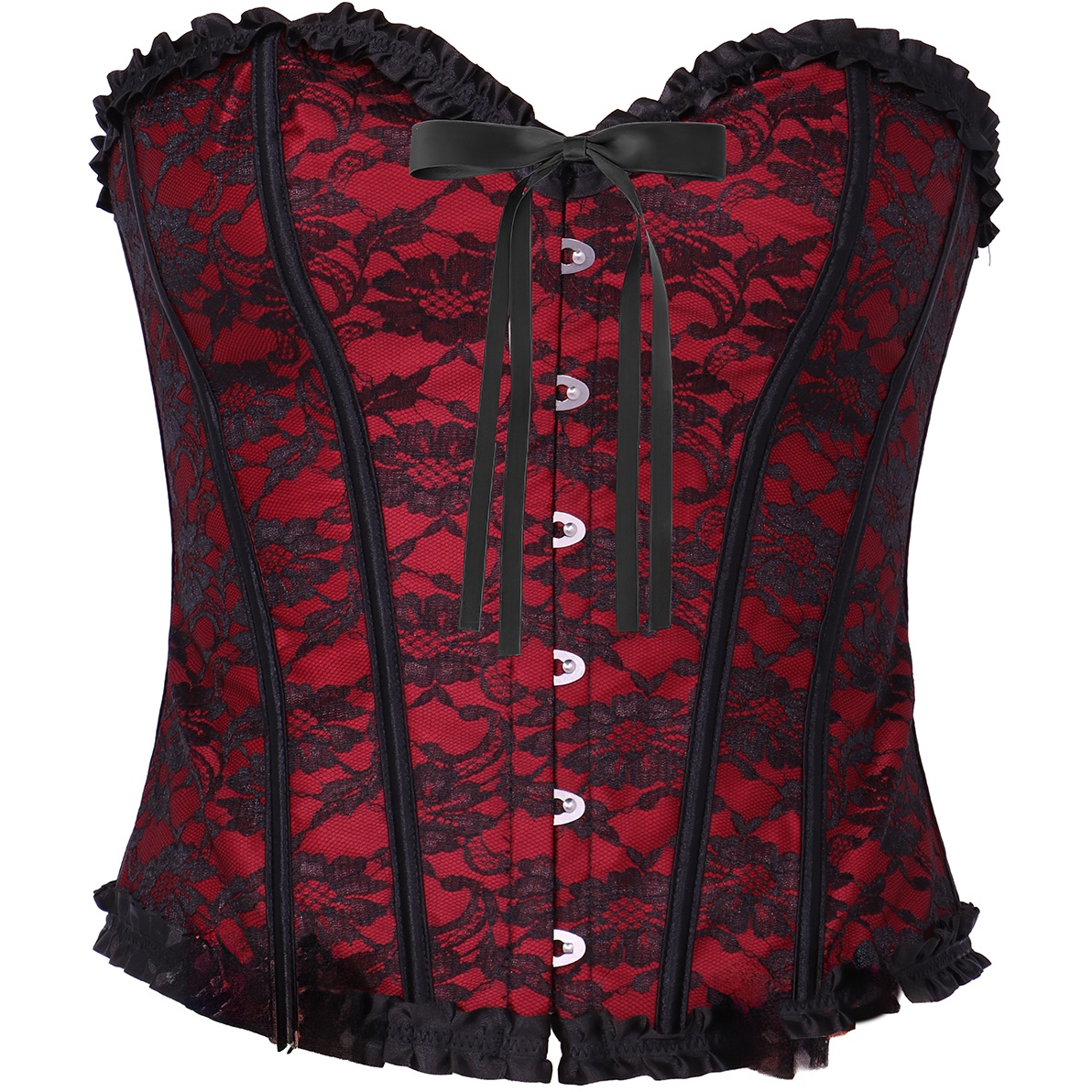 Bordeaux-Spitzenkorsett im markanten Burlesque-Stil, das Ihre Figur betont und eine raffinierte, verführerische Ausstrahlung verleiht. Es überzeugt durch seine klare Struktur mit sichtbaren Korsettstäben und dem vorderen Busk-Verschluss für einen festen, schmeichelhaften Sitz. Rüschdetails und eine kleine Schleife am Dekolleté setzen einen retro-femininen Akzent. Ideal, um Ihre Abendlooks zu vervollständigen, bei Auftritten zu glänzen oder als Blickfang in von Vintage inspirierten Outfits.