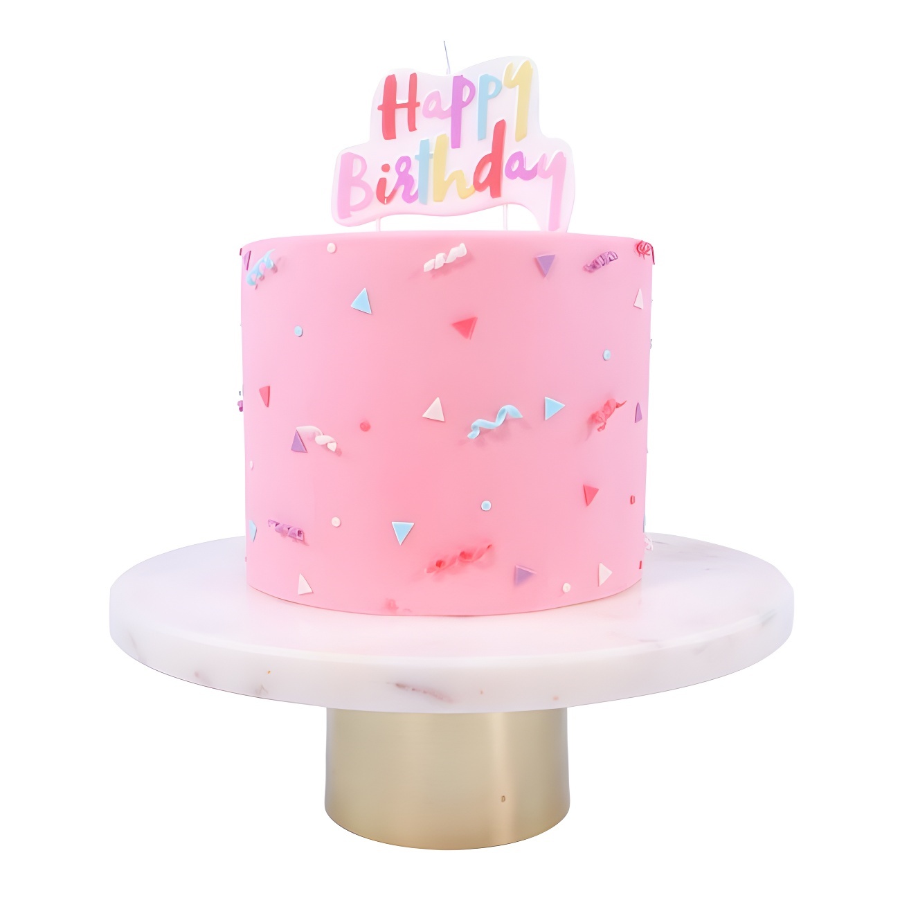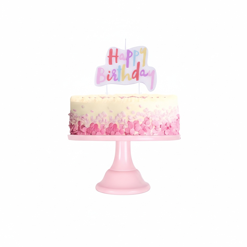 Happy Birthday Kerze mit weißem Hintergrund, farbenfroher Botschaft und pastellfarbenen Tönen.
