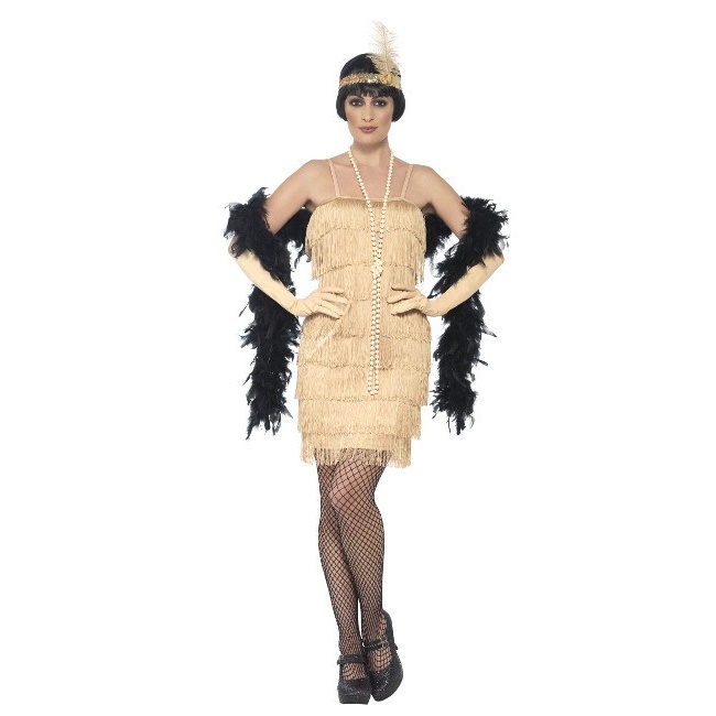 Dies ist ein wunderschönes dreiteiliges Outfit, bestehend aus einem kurzen Fransenkleid, langen Handschuhen und einem Kopfschmuck mit Federn. Alles in der gleichen creme-goldenen Farbe für einen eleganten Look.