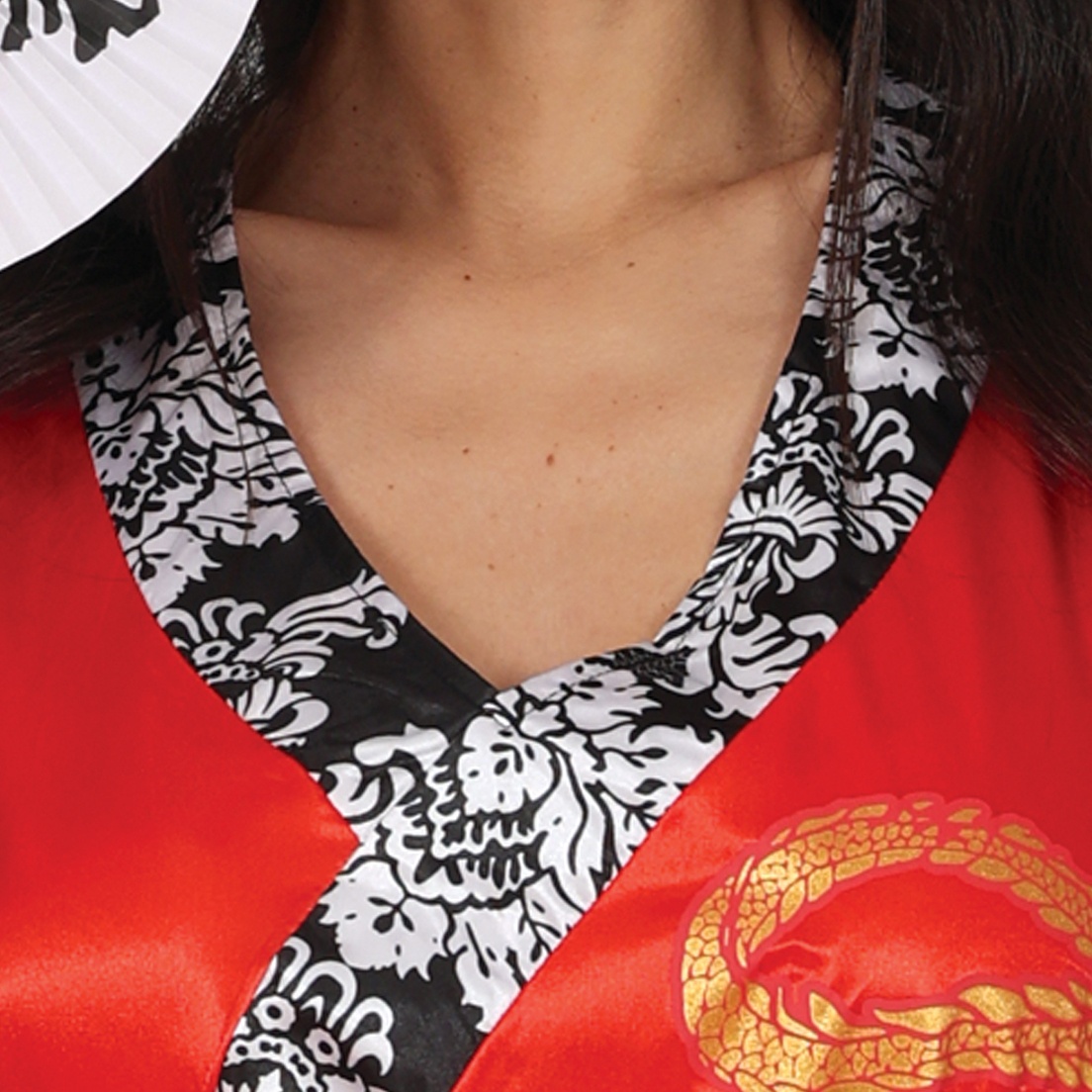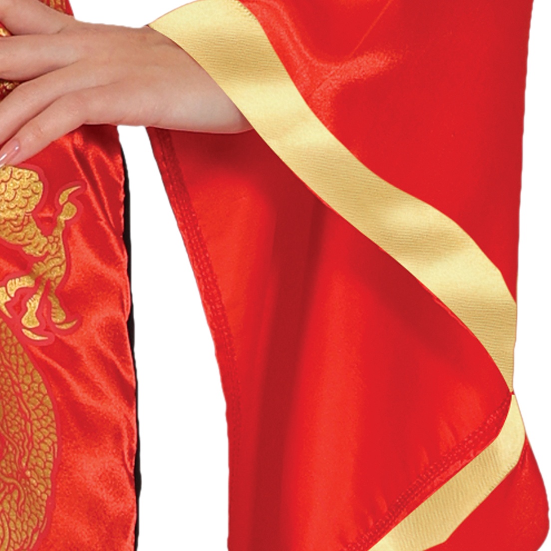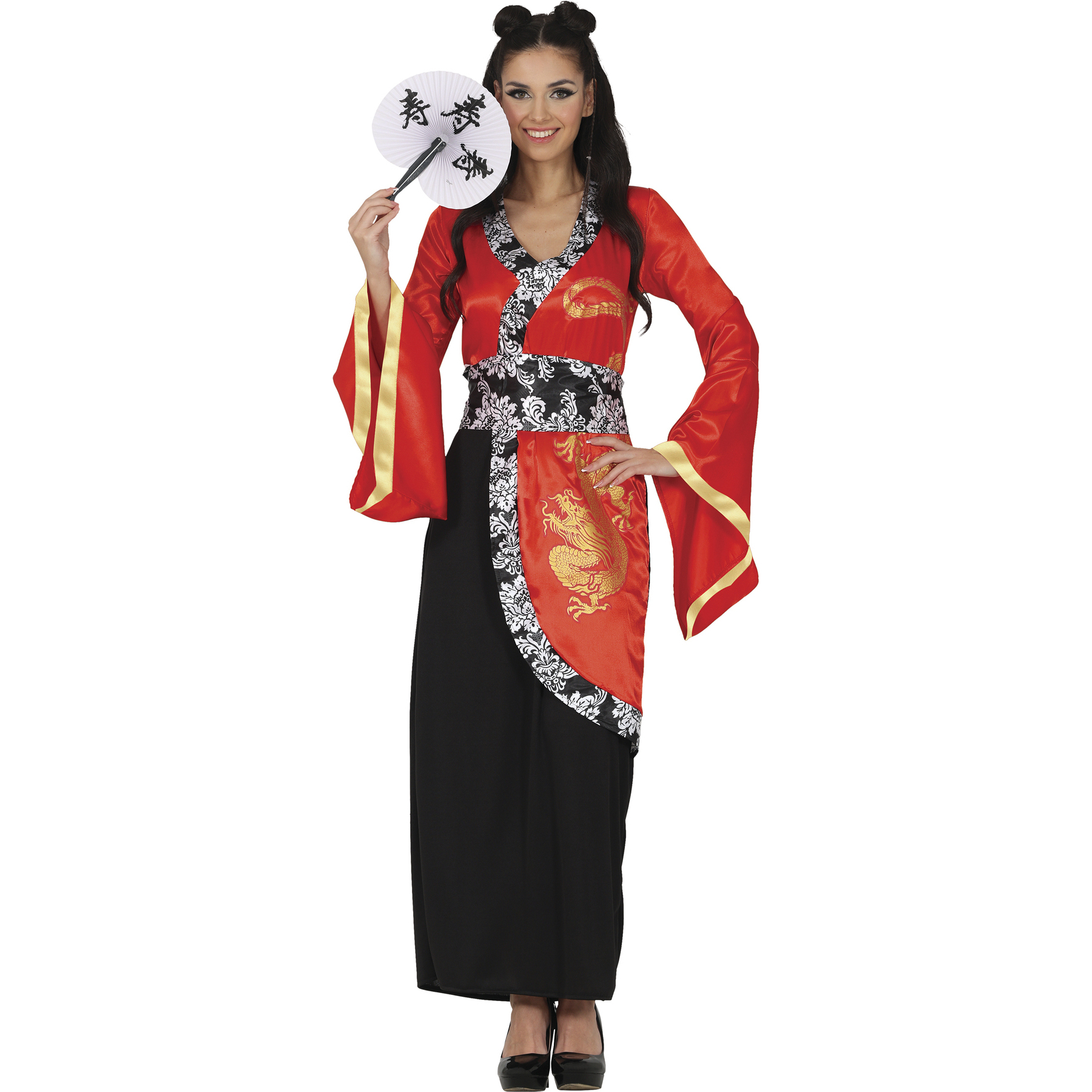 Ein klassisches orientalisches Damenmodell, bestehend aus einem Kleid in Rot und Schwarz mit goldenen Details, ergänzt durch einen Gürtel.