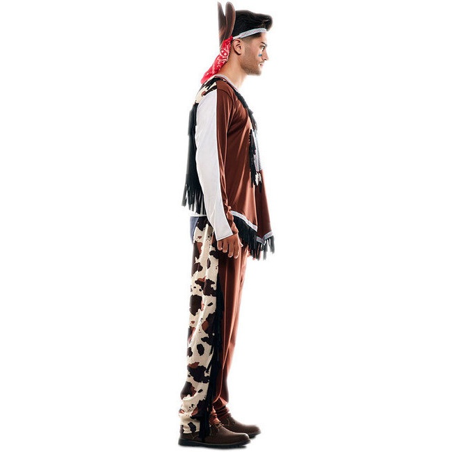 Das Kostüm ist ideal für Karneval, Junggesellenabschiede und Junggesellinnenabschiede. Es besteht aus einem Hauptteil mit einem braunen T-Shirt, das mit weißen Linien, schwarzen Fransen und anderen indianischen Verzierungen geschmückt ist. Ergänzt wird es durch eine passende Hose mit Gummibund und ein dekoratives Stirnband, auf dessen Vorderseite der Hut und das Gesicht eines Cowboys mit Kopftuch zu sehen sind. Auf der Rückseite trägt er ein weißes Hemd mit Jeansweste und Zierknöpfen, die mit Klettverschluss geschlossen werden. Die dazu passende Hose vervollständigt das Outfit auf der Vorderseite.