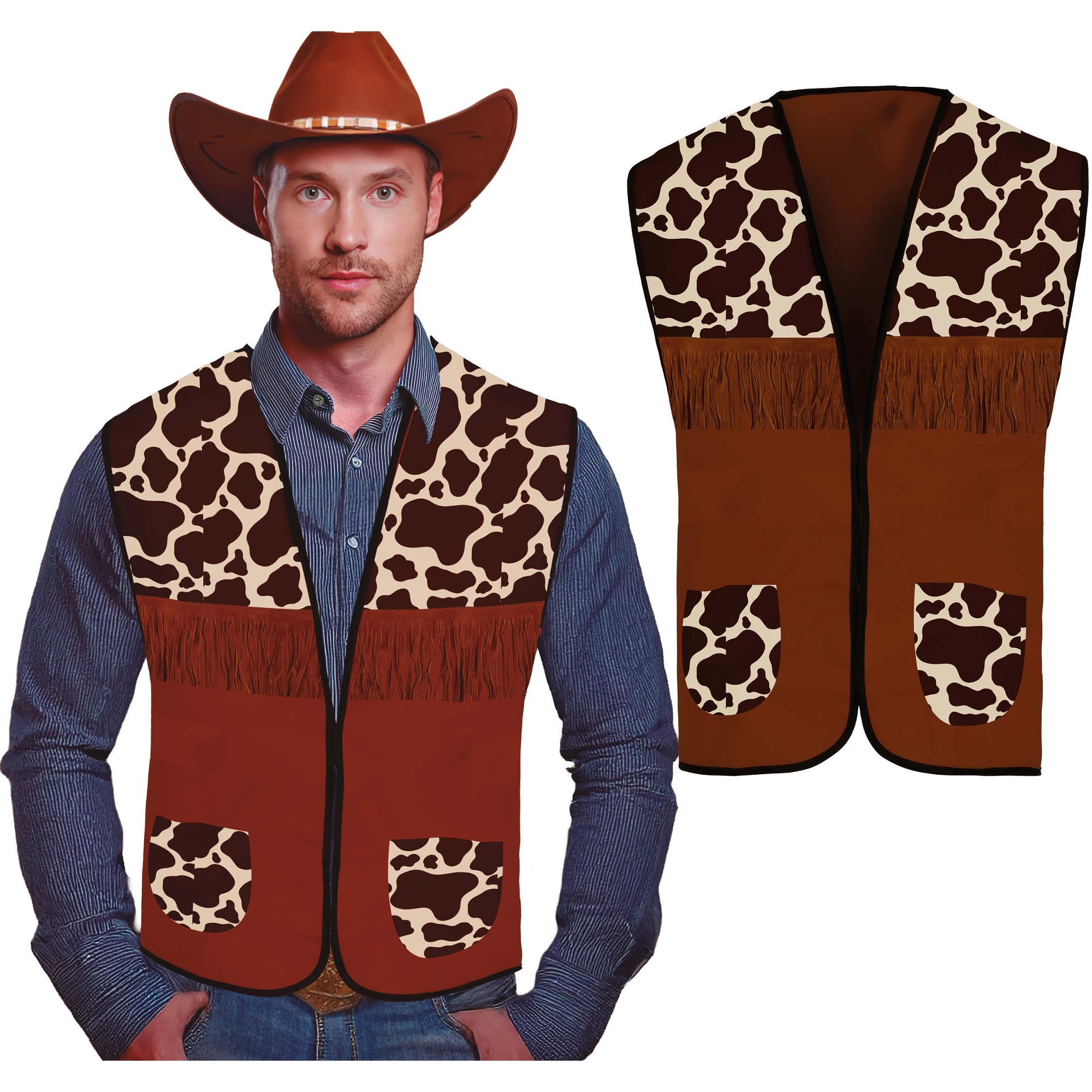 Cowboy-Weste im Westernstil für Erwachsene mit Details, die an den klassischen Look des Westens erinnern. Sie ist mit Kuhfleckenmuster an Schultern und Taschen sowie einer Fransenleiste auf der Brust versehen, die dem Gesamtbild Charakter verleiht. Aus leichtem Polyester gefertigt, sorgt sie für angenehmen Tragekomfort als Kostüm- oder Outfit-Ergänzung. Der offene Schnitt und die dunkle Einfassung betonen den Kontrast des Designs.