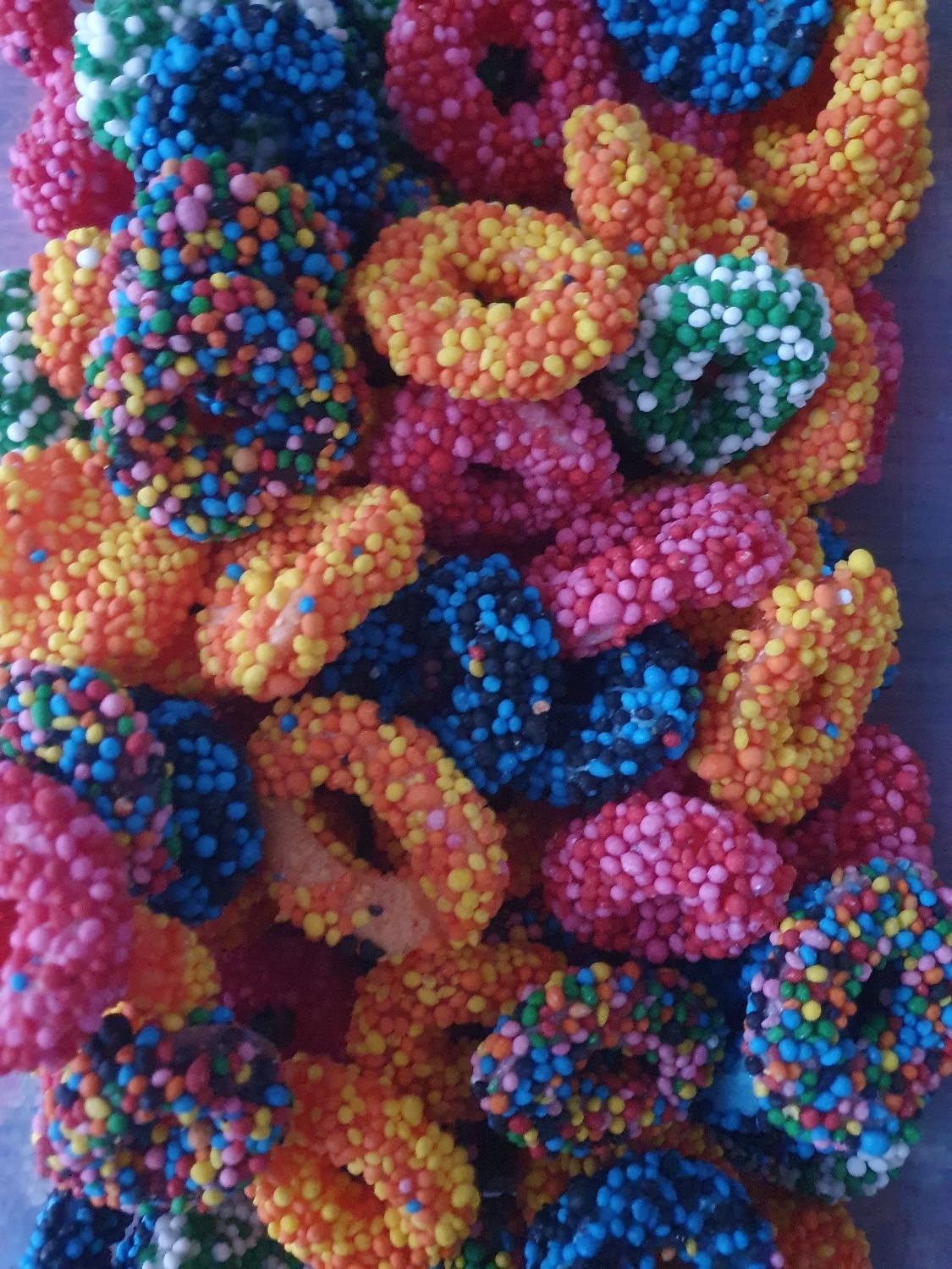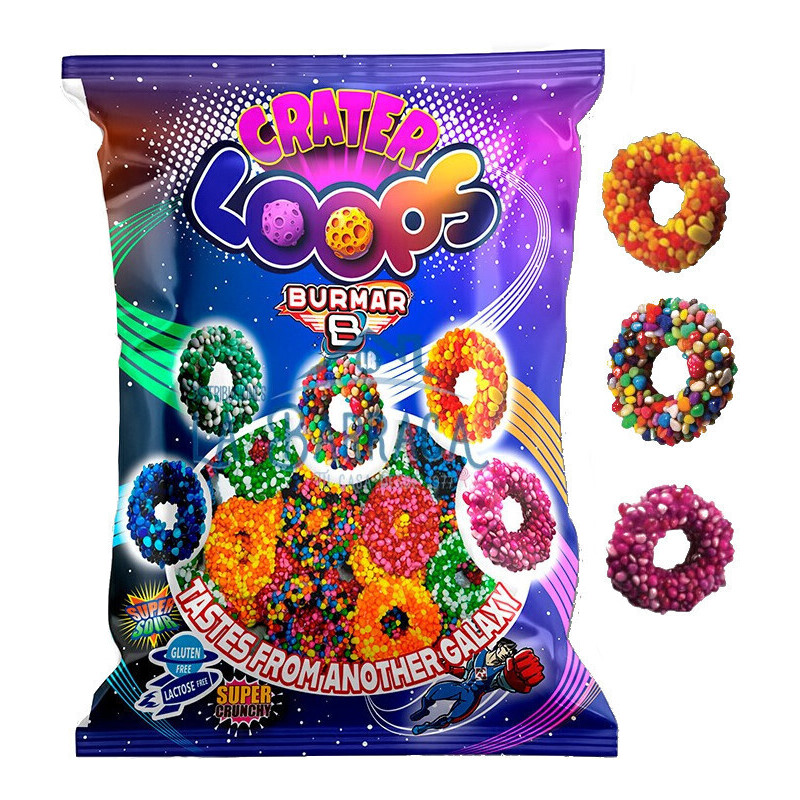 Zutaten: Zucker, Glukosesirup, Wasser, Reismehl, Halal Rindergelatine, Säuerungsmittel: E296, E330, Stabilisatoren: E350ii, Überzugsmittel: E414, Aromen, Farbstoffe: E102, E122, E129, E133, E158. E102, E122 und E129 können die Aktivität und Aufmerksamkeit bei Kindern beeinträchtigen.