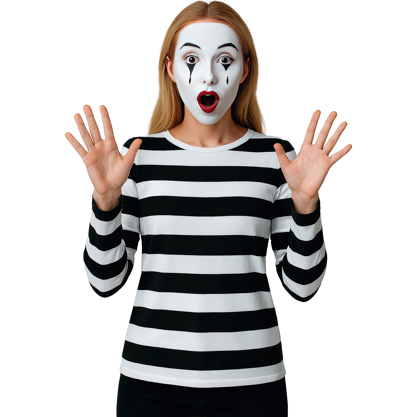 Damen-T-Shirt mit horizontalen schwarz-weißen Streifen, konzipiert, um den klassischen Pantomime-Look zu erzielen. Der gerade Schnitt und die langen Ärmel verleihen einen zeitlosen, leicht kombinierbaren Look. Aus Polyester gefertigt bietet es Leichtigkeit und einen guten Fall - ideal für Auftritte und Veranstaltungen. Perfekt als zentrales Element Ihres thematischen Outfits oder als Ergänzung für Theaterkostüme.