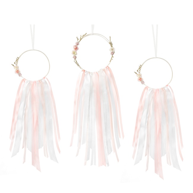 Diese Schachtel enthält 3 Ringe aus Weidengeflecht, die mit Blumen und Schleifenbändern in den Farben Weiß, Hellrosa und Pfirsich geschmückt sind.