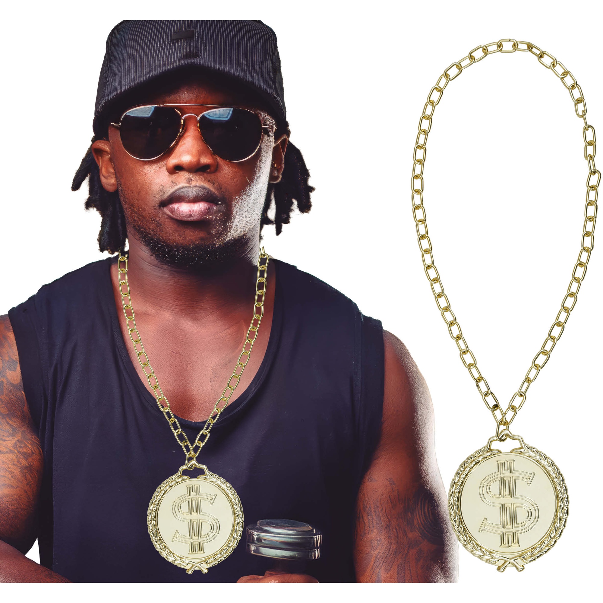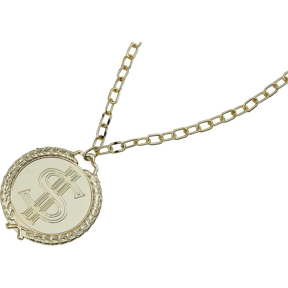• Große Medaille mit Dollar-Symbol, die Ihrem auffälligen Rapper-Look Präsenz verleiht.