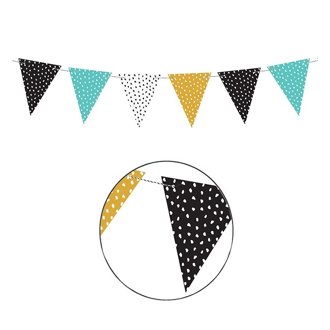 Er besteht aus Pappdreiecken in Aquamarin, Schwarz, Senf und Weiß mit weißen Sprenkeln, die Sie mit einem schwarz-weißen Band aneinander befestigen können.