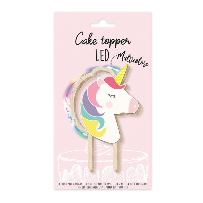 Lustiger Tortenaufleger aus Holz mit einem Einhorn, um Farbe in Ihre Torten zu bringen. Es hat mehrere farbige LEDs, die blinken.