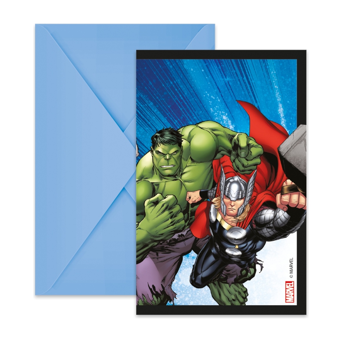 Los Vengadores Themen?Einladungen mit dynamischen Illustrationen von Hulk und Thor, die die Aufmerksamkeit der Kleinen auf sich ziehen.
