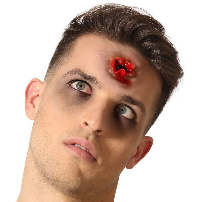 Sehr realistische Narbe aus Latex mit Einschussloch. Ein unverzichtbares Schmink-Accessoire für ein wahrhaft schauriges Halloween.