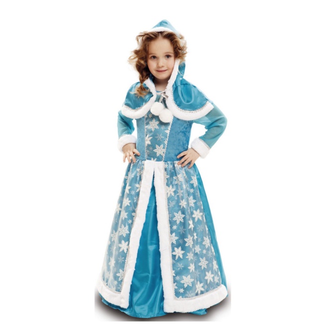 Das Kleid wird mit einem Unterrock mit Reifendekor geliefert, der die Rockform noch schöner und voluminöser macht. Die Haube mit Kapuze ist aus dem gleichen Stoff und in der gleichen Ausführung, mit weißem Pelzrand und silberner Borte. Es hat auch sehr lustige Pompons.
