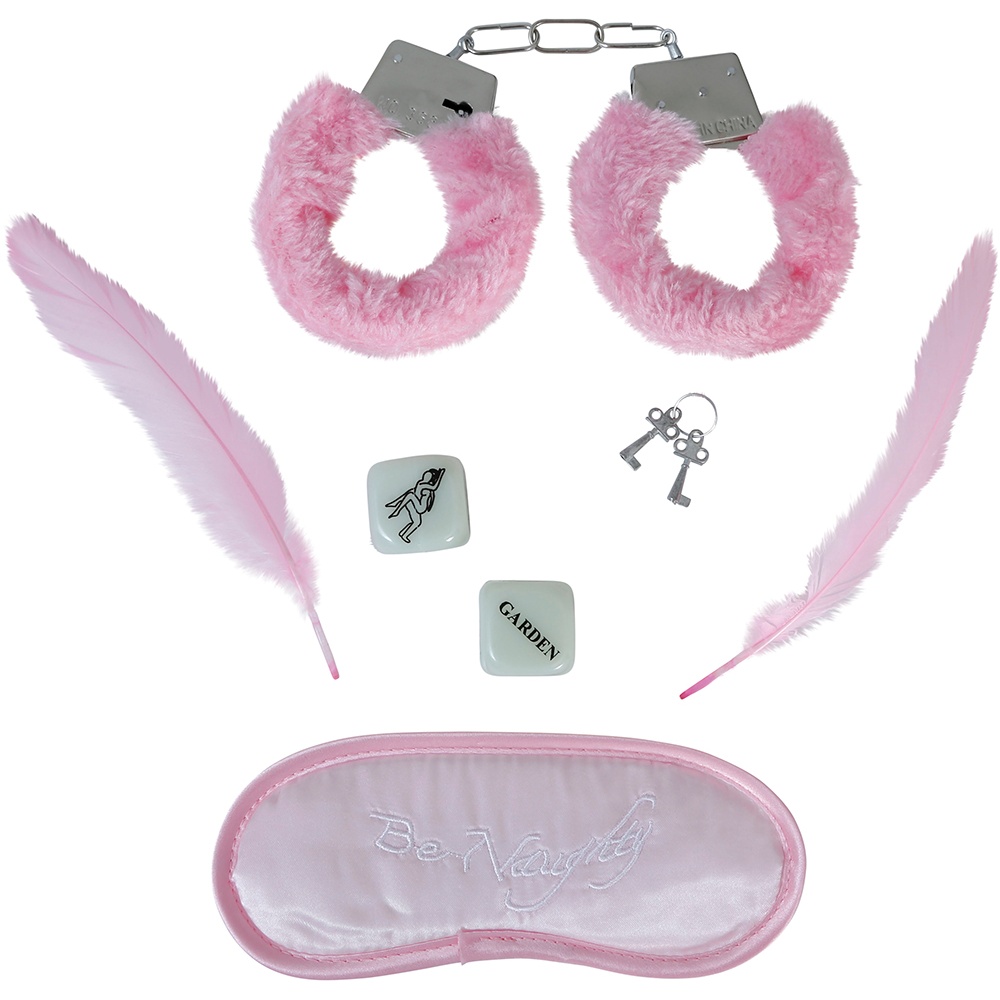 Erotik-Set mit Augenmaske, Handschellen, Federn und Würfel