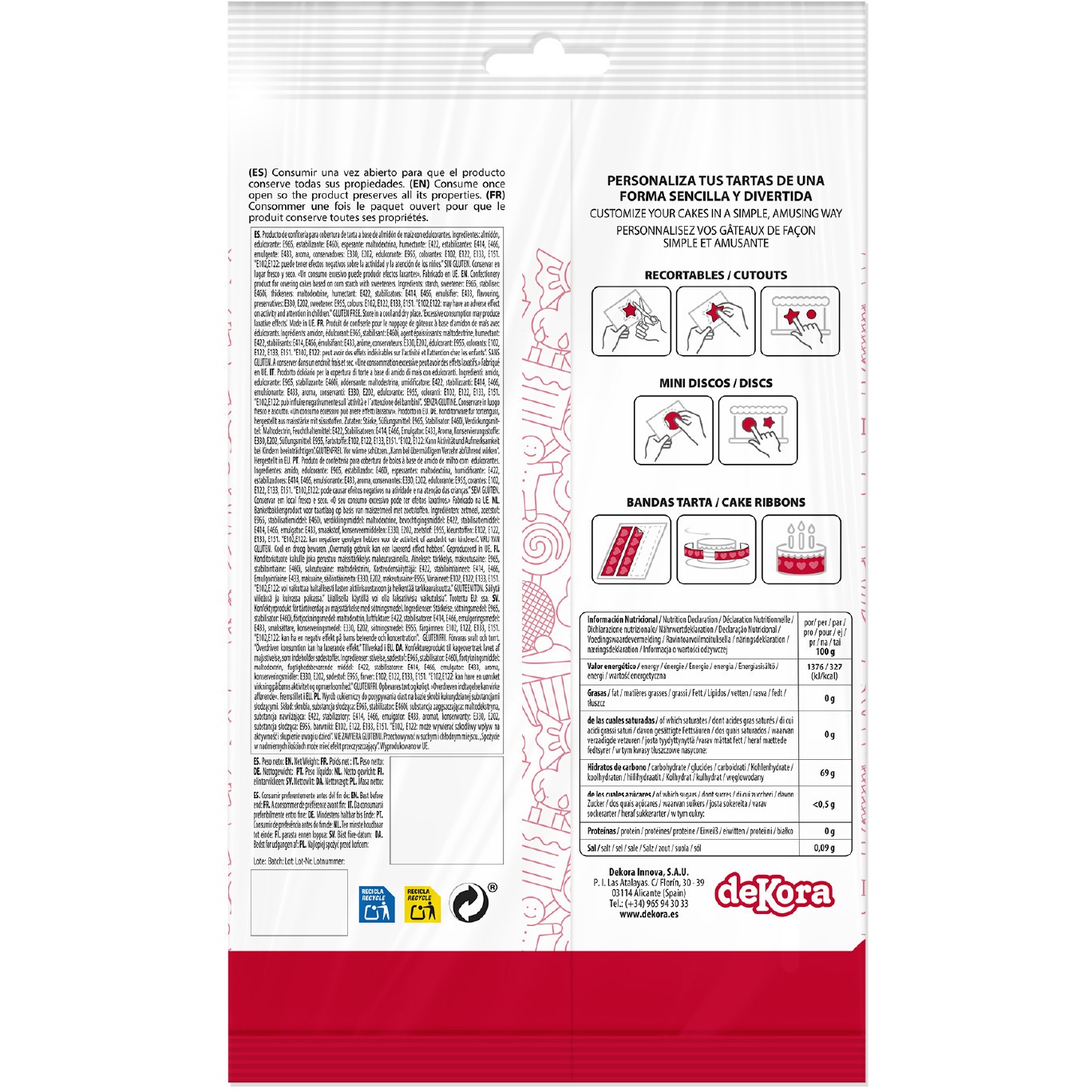 Zutaten: Stärke, Aroma, Feuchthaltemittel (E422), Emulgatoren (E433), Stabilisatoren (E414, E460i, E466), Konservierungsstoffe (E202, E330), Süßstoffe (E955, E965), Verdickungsmittel (Maltodextrin), Farbstoffe (E102, E122, E133, E151).