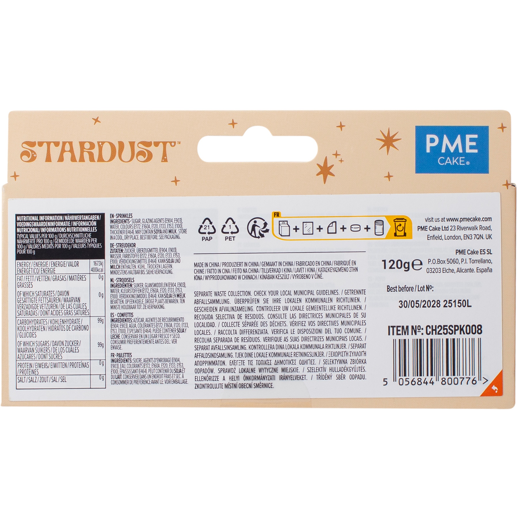 Zutaten: Zucker, Überzugsmittel (E904, E93), Wasser, Farbstoffe (E172, E160A, E120, E133, E153, E100), Verdickungsmittel (E464).