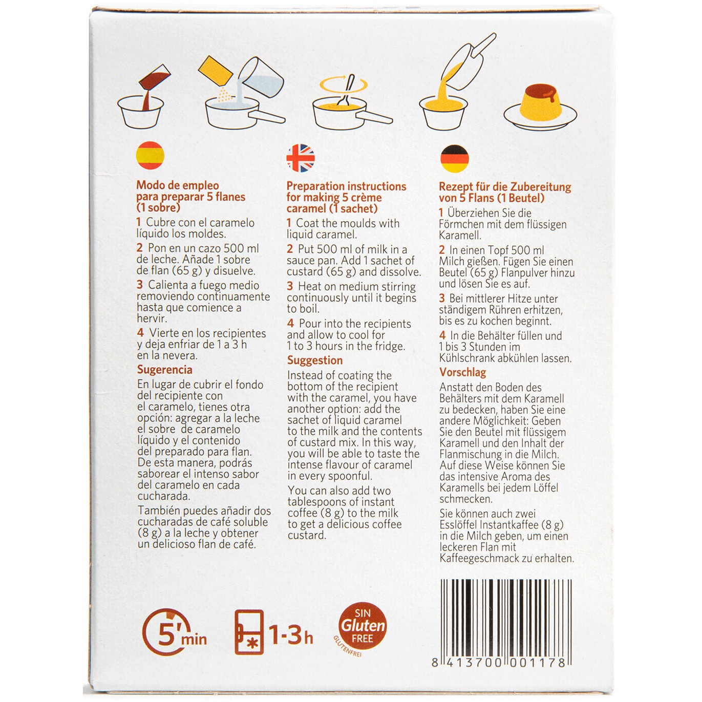 Zutaten Flan: Zucker, Verdickungsmittel (Carrageen), Aromen, Sonnenblumenöl und Farbstoffe (E160b (ii) und Kurkumin).