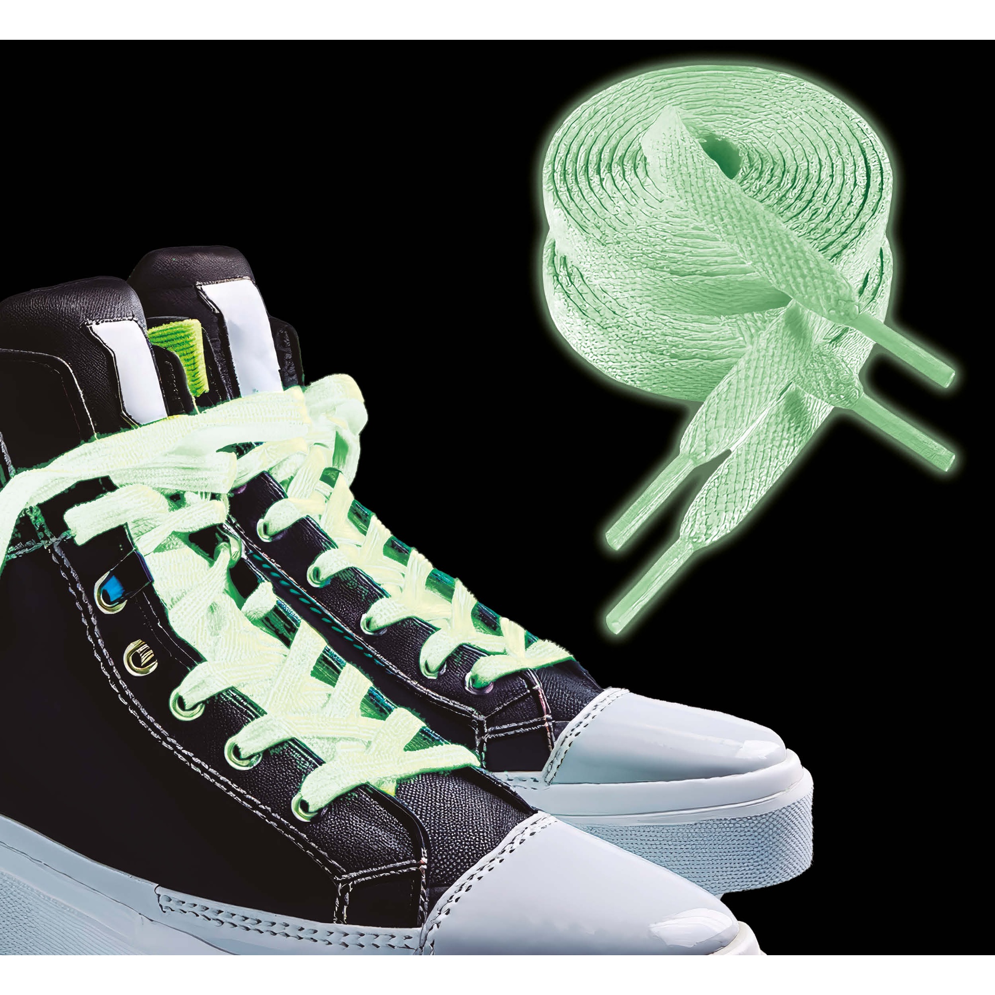 Paar fluoreszierender Schnürsenkel (120 cm) aus Polyester. Sie laden sich durch Umgebungslicht auf und geben im Dunkeln ein auffälliges Leuchten ab, damit Ihre Schuhe hervorstechen. Das flache und robuste Design erleichtert das Einfädeln durch die Ösen und sorgt dafür, dass der Knoten gut hält. Die Länge eignet sich für die meisten urbanen Sneakers und Stiefelmodelle und sorgt bei schlechten Lichtverhältnissen für ein modernes, gut sichtbares Finish.