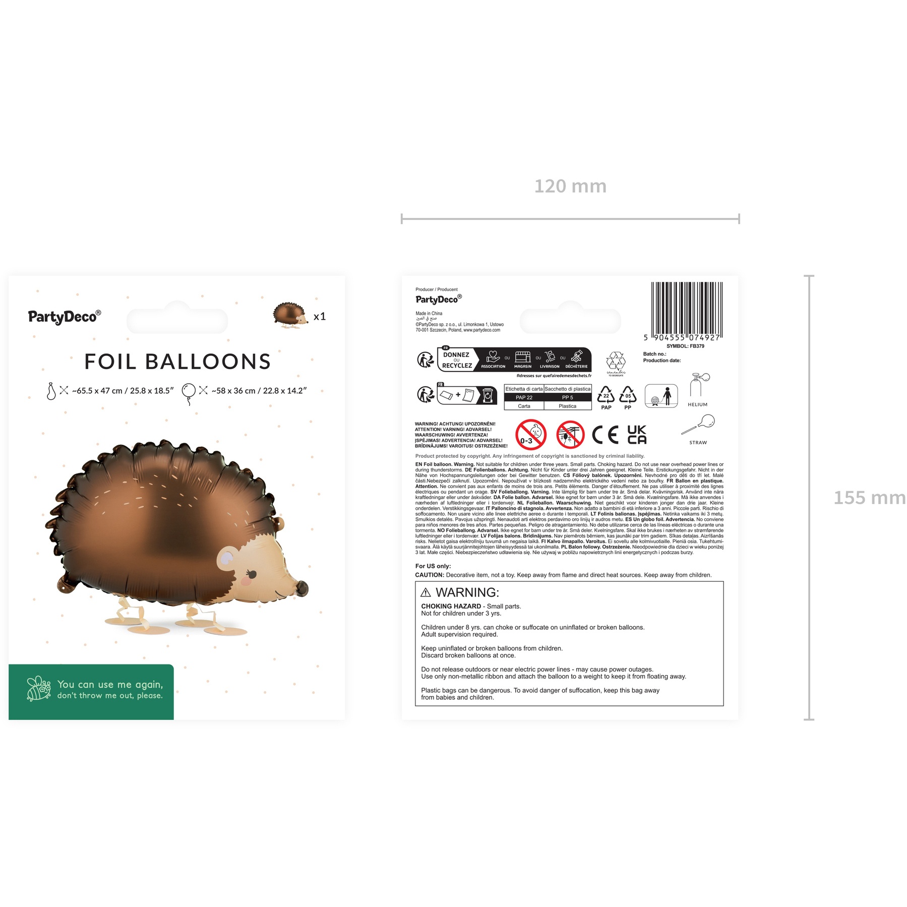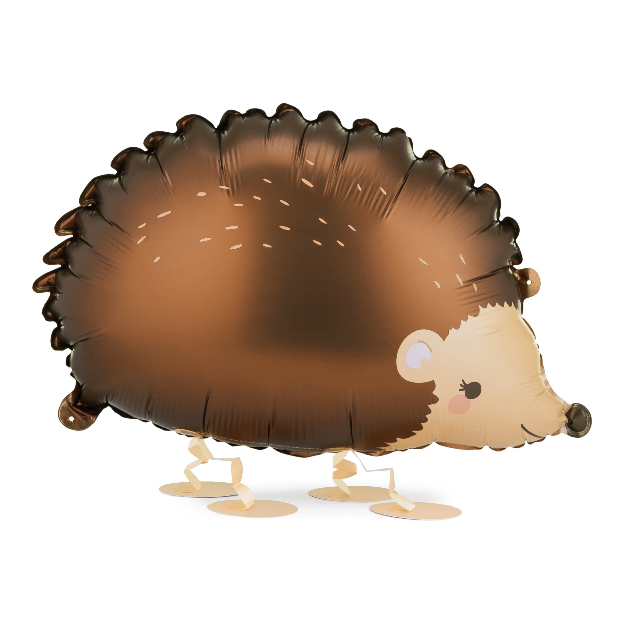 Foilballon in Form eines laufenden Igels in Brauntönen, mit sympathischem, auffälligem Look zur Dekoration von Kinderfeiern und Geburtstagen. Größe vor dem Aufblasen ca. 65,5 x 47 cm; nach dem Aufblasen ca. 58 x 36 cm. Die Beinchen sind etwa 10 cm hoch, sodass der Ballon wie laufend auf ebenen Flächen steht. Für Heliumfüllung vorgesehen und ideal, wenn Sie der Dekoration ein lustiges, fotogenes Detail hinzufügen möchten.