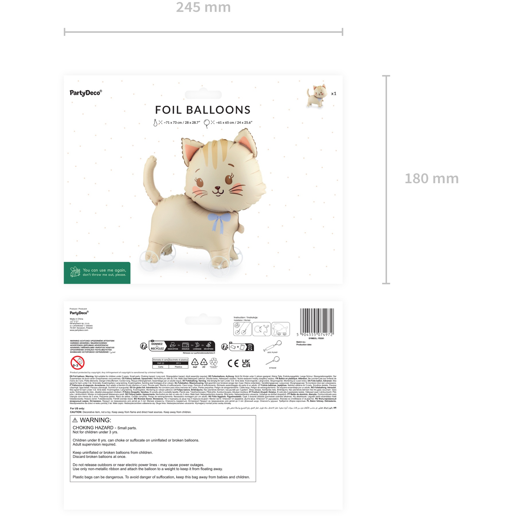Folienballon in Katzenform in hellem Beige, konzipiert, um Ihrer Kinderparty einen liebevollen und lustigen Touch zu verleihen. Ungefähre Größe vor dem Aufblasen: 71 x 73 cm; Größe nach dem Aufblasen: 61 x 65 cm. Nur für Luftfüllung geeignet; behält eine kompakte, auffällige Silhouette, die Kinder anzieht. Ideal als dekoratives Herzstück bei Geburtstagen und anderen Kinderfeiern.