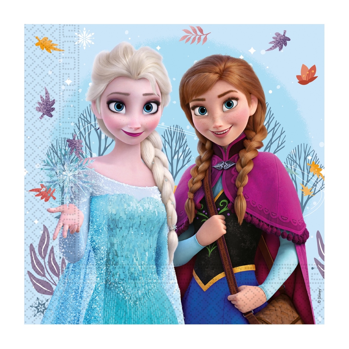 Packung mit Frozen-Servietten in Blautönen, mit Elsa und Anna als Motiv. Ideal, um Ihre Kinderfeiern mit einem magischen und unterhaltsamen Akzent zu gestalten. Die Servietten sind zweilagig für mehr Weichheit und Stabilität und wurden speziell für Fans der Saga entworfen.