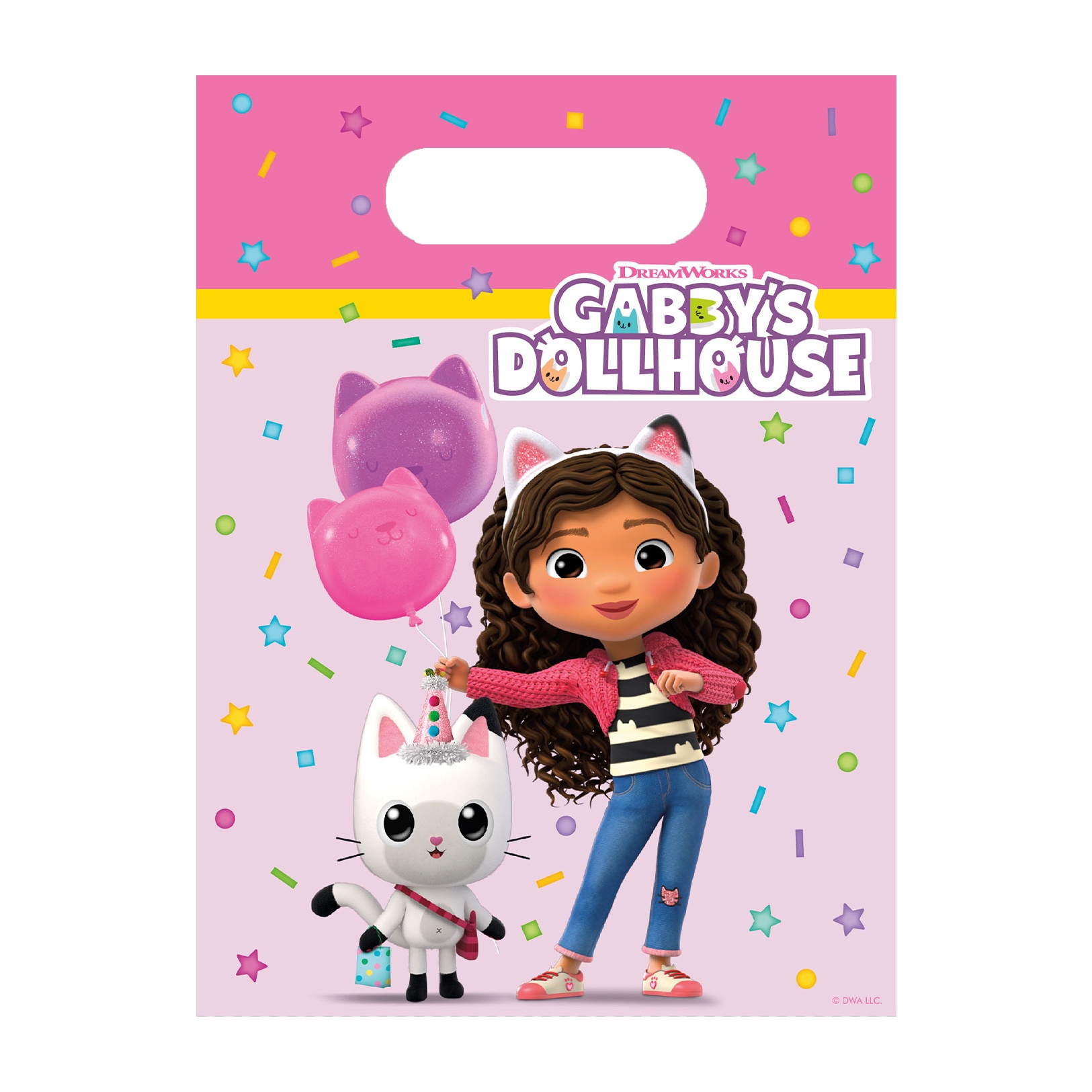 Party-Tüten mit Gabby's Dollhouse-Motiv - ideal, um jeder Kinderfeier einen fröhlichen, bunten Akzent zu verleihen. Sie zeigen Figuren-Illustrationen und Konfetti in lebhaften Farben, die Kinder begeistern werden. Die ausgestanzten Griffe ermöglichen bequemes Tragen, und das leichte Format erleichtert Ihnen das Zusammenstellen von Mitgebseln und Geschenktüten.