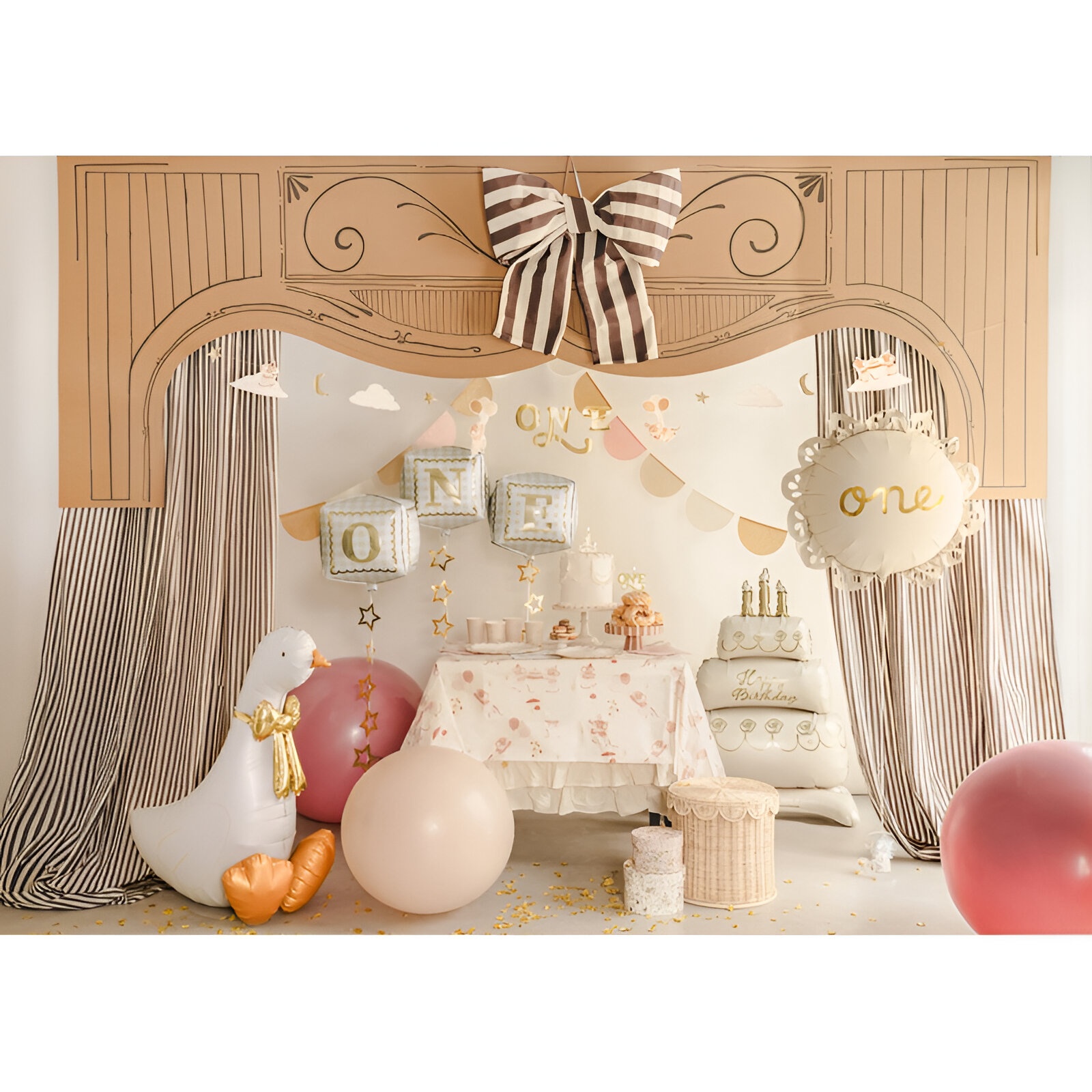 Dekorativer Gänseballon mit weißem Körper und eleganter goldener Schleife, der Ihren Kinderfeiern eine besondere Note verleiht.