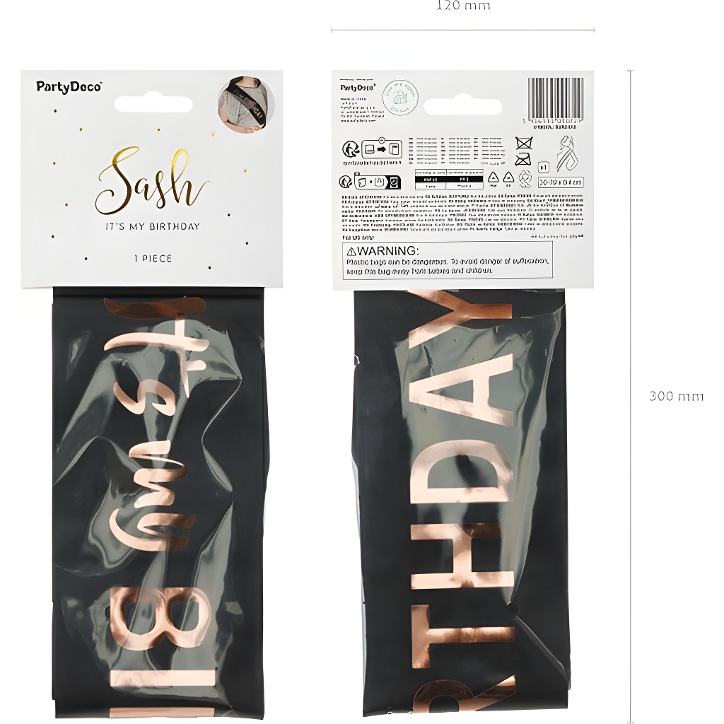 Schwarze Satinschärpe mit roségoldener Aufschrift 'It's my birthday”, perfekt, um stilvoll zu feiern.