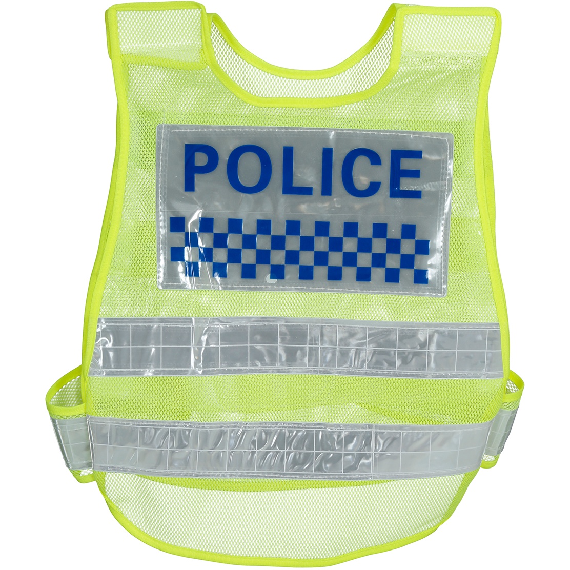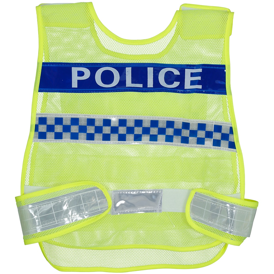 - Realistisches Erscheinungsbild mit der Aufschrift "POLICE" und Schachbrettstreifen, die an offizielle Westen erinnern.