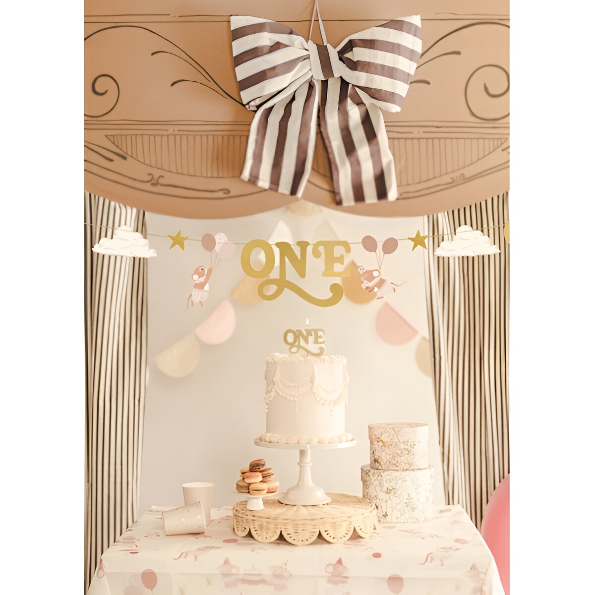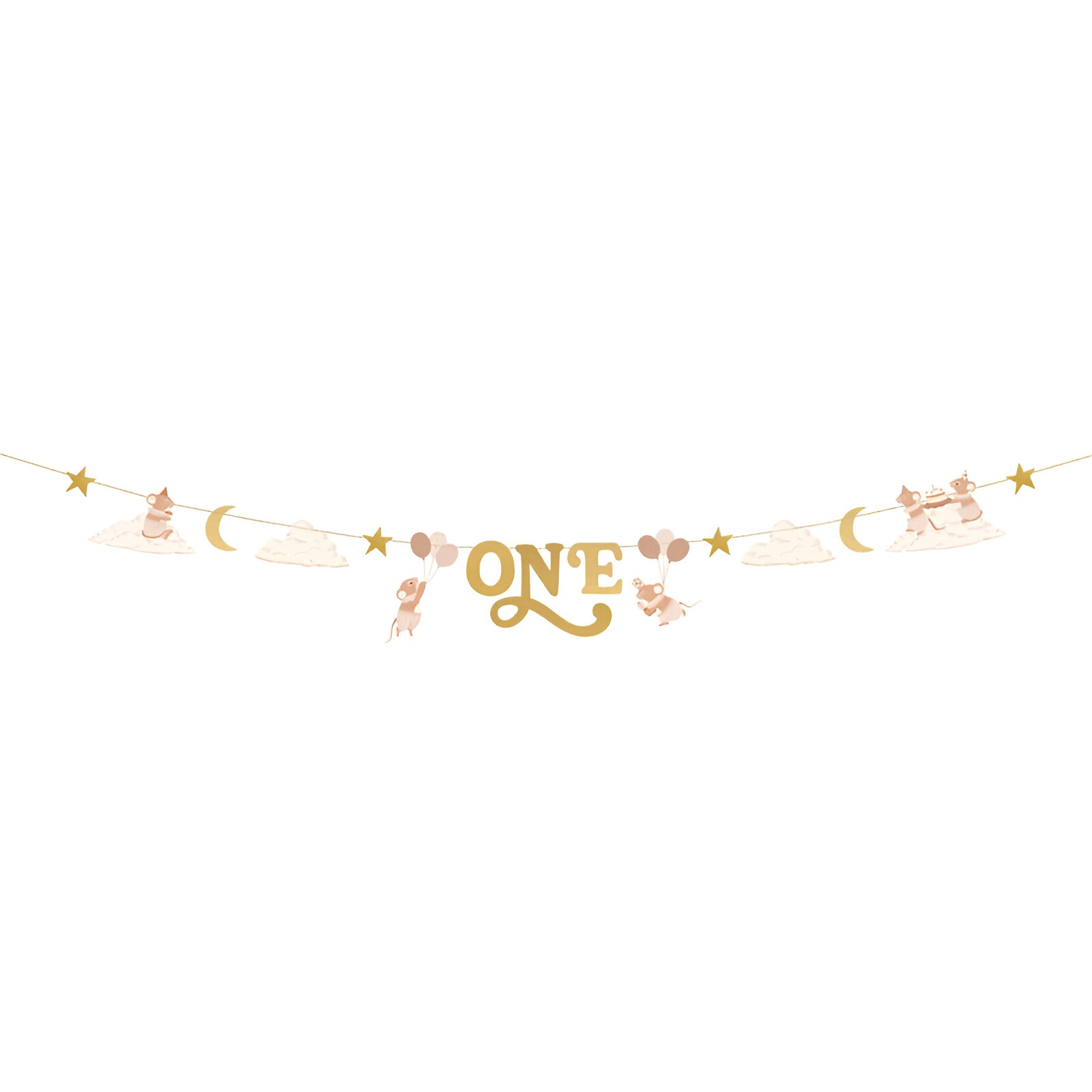 Girlande 'ONE' mit zartem Mäuse?Design in Beigetönen und goldenen Details - perfekt für den ersten Geburtstag.