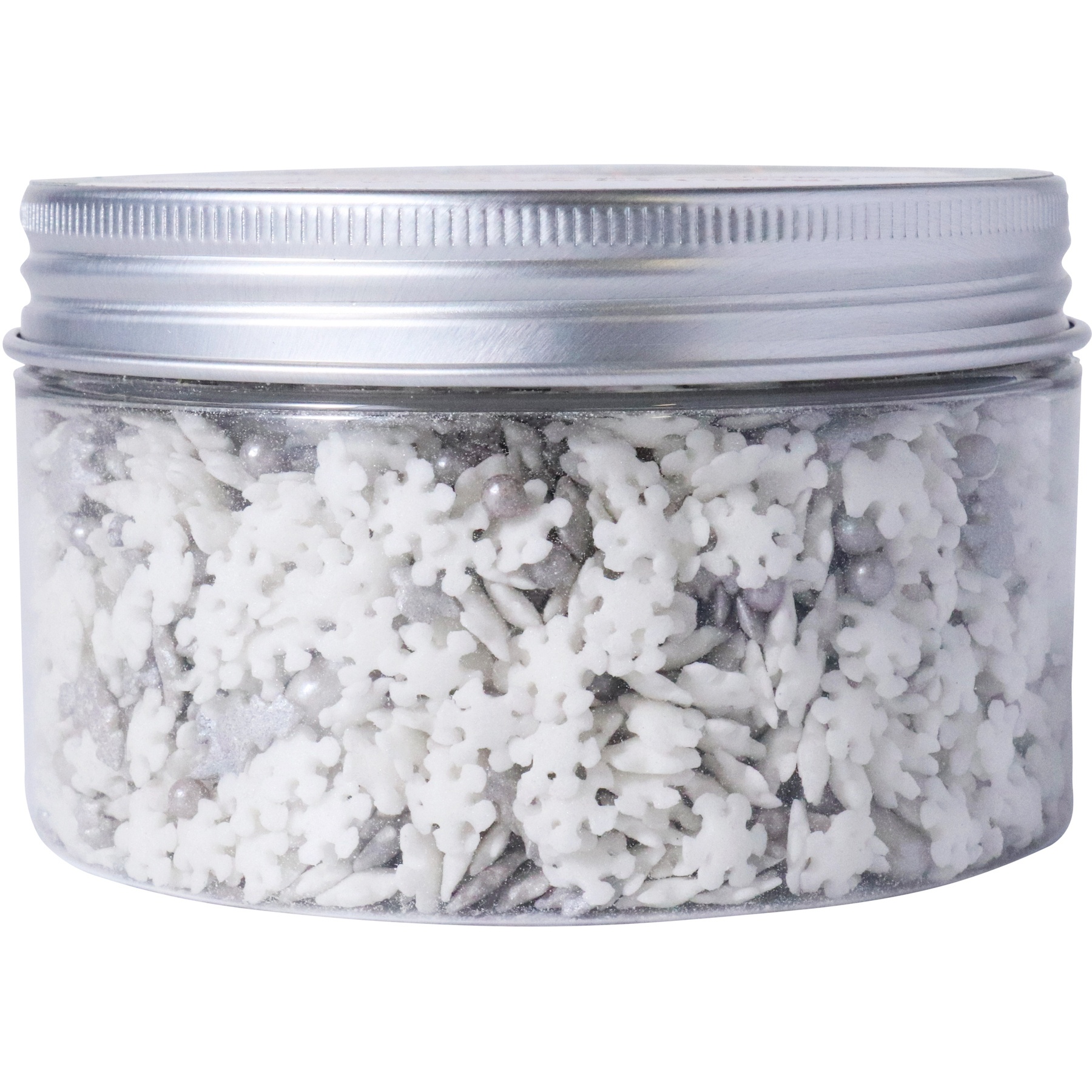 - 160 g Streusel in einer fröhlichen Mischung aus Sternen, Schneeflocken, Perlen und Streuseln, mit einem silber-weißen Thema.