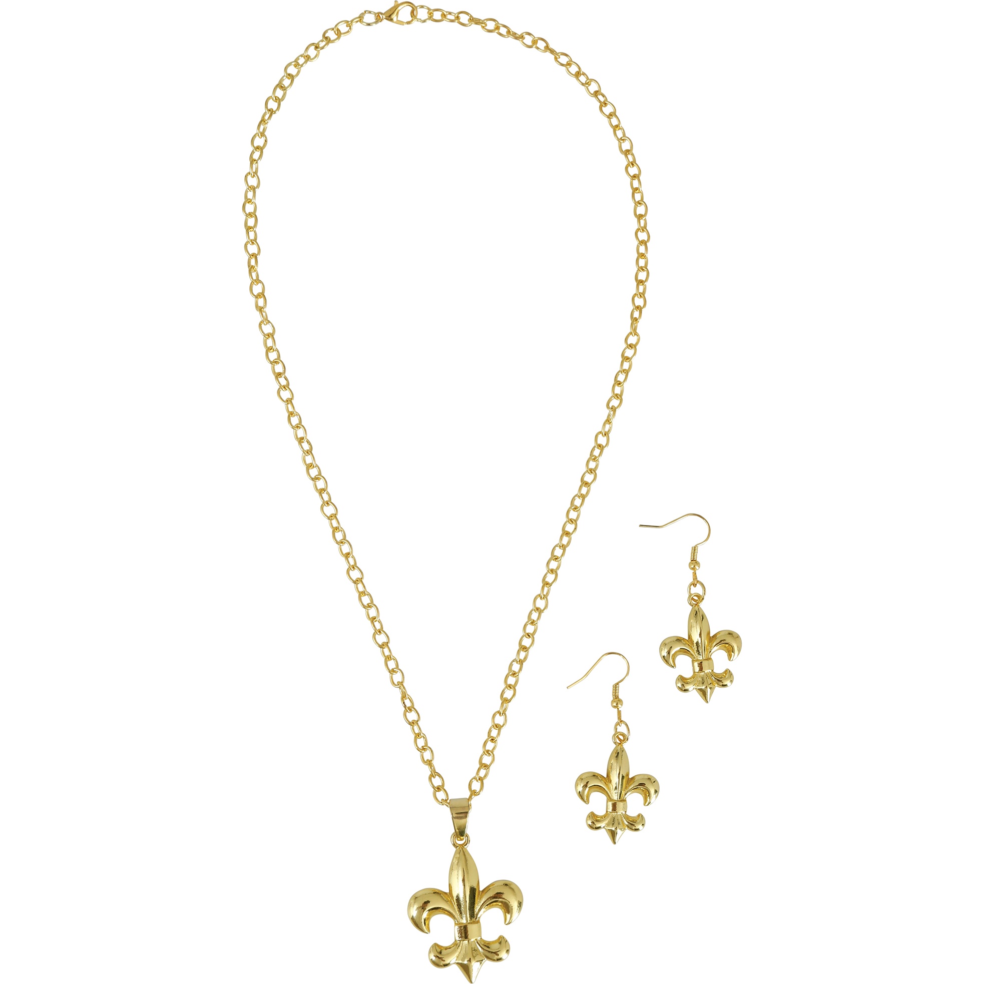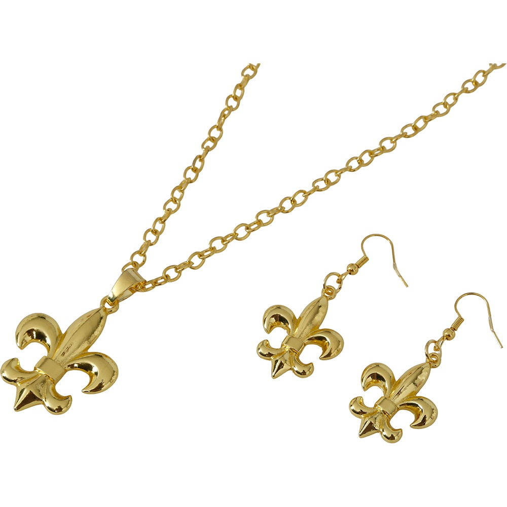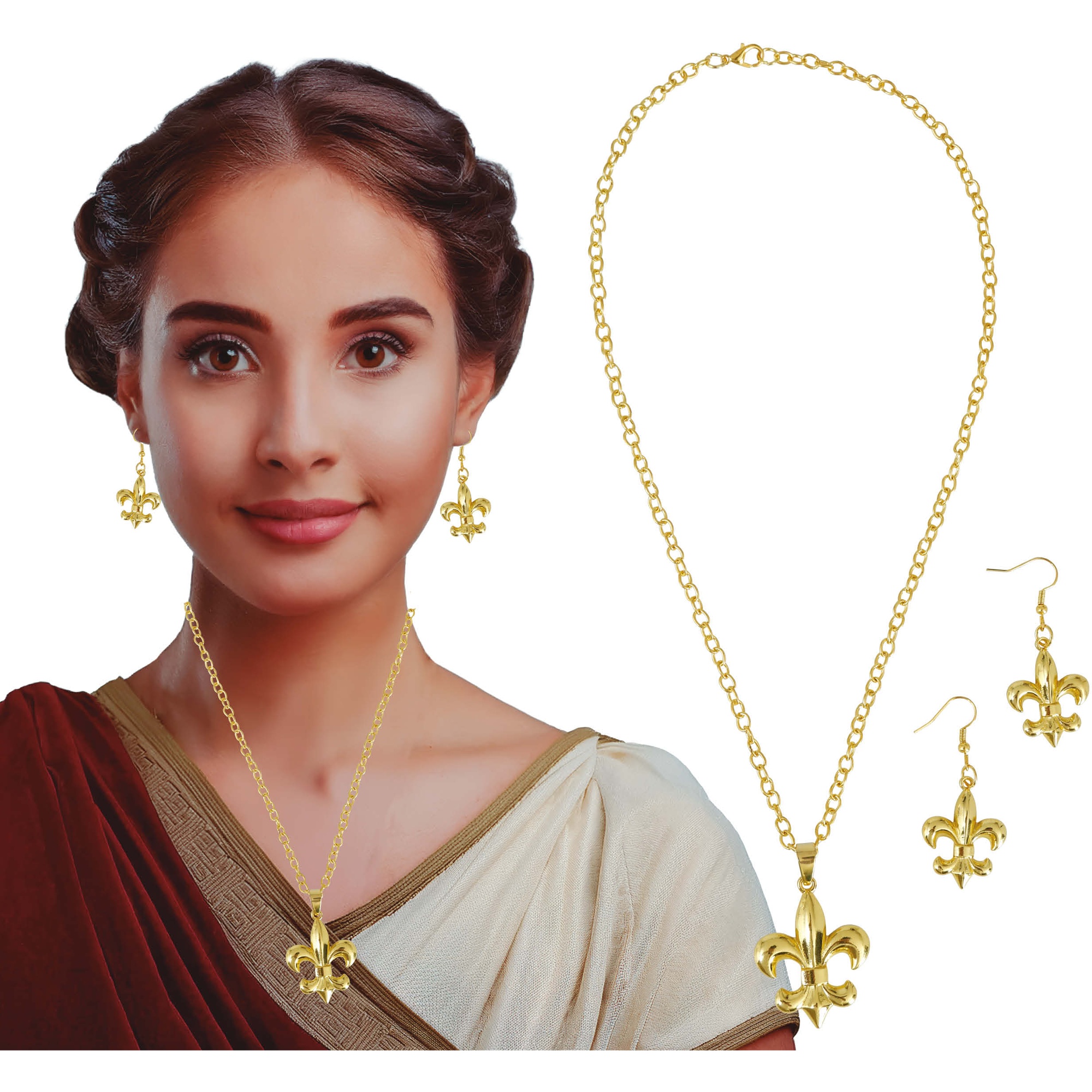 Elegantes Set, inspiriert von der Schmuckkunst des antiken Roms, mit einem charakteristischen Fleur?de?lis?Motiv. Die goldene Oberfläche sorgt für ein gepflegtes Funkeln und hebt Ihr historisches oder Fantasy?Outfit hervor. Leichte, bequeme Stücke, entworfen, um Ihnen bei Feiern und Veranstaltungen eine imperiale Note zu verleihen.